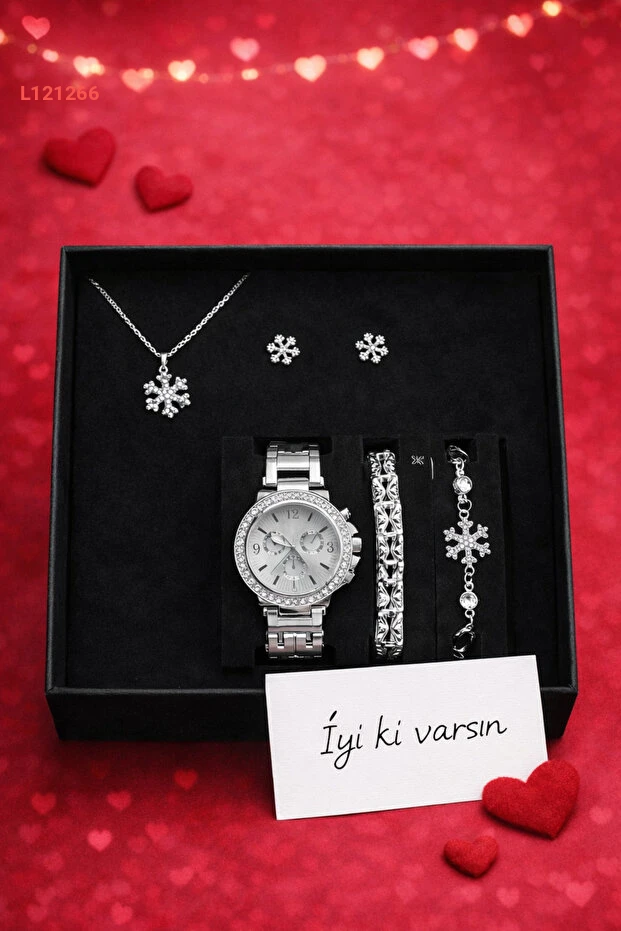 استمتع بأناقة لا مثيل لها مع مجموعة هدايا Arzu Butik المكونة من ساعة معصم نسائية بلون الفضة، فضلاً عن عقد وأقراط متناسقة. تضفي هذه القطع الراقية لمسة من الفخامة على إطلالتك، مما يجعلها مثالية لكل مناسبة. اجعل كل لحظة مميزة مع هذا الكومبو الفريد الذي يجمع بين الجمال والأناقة.