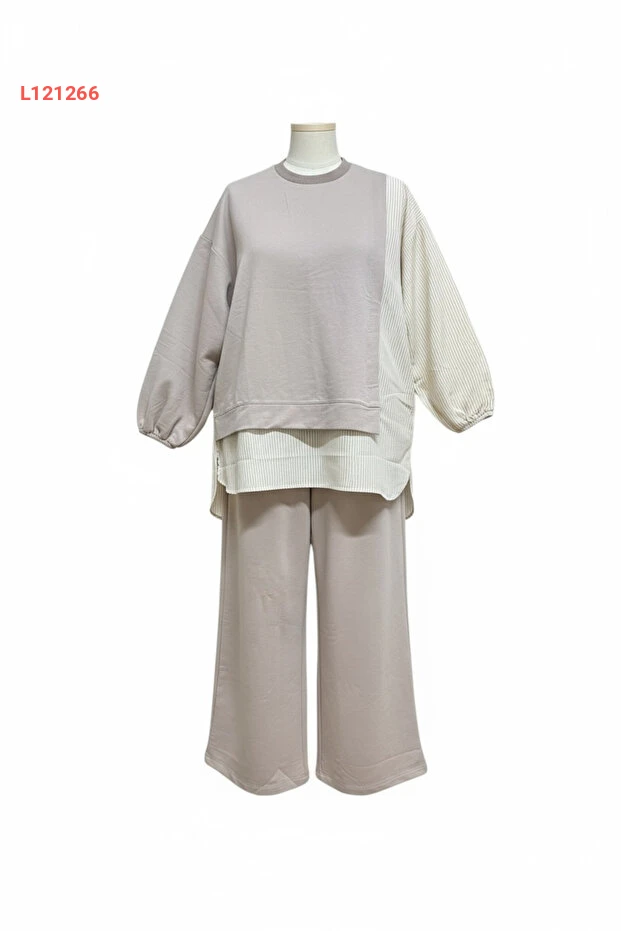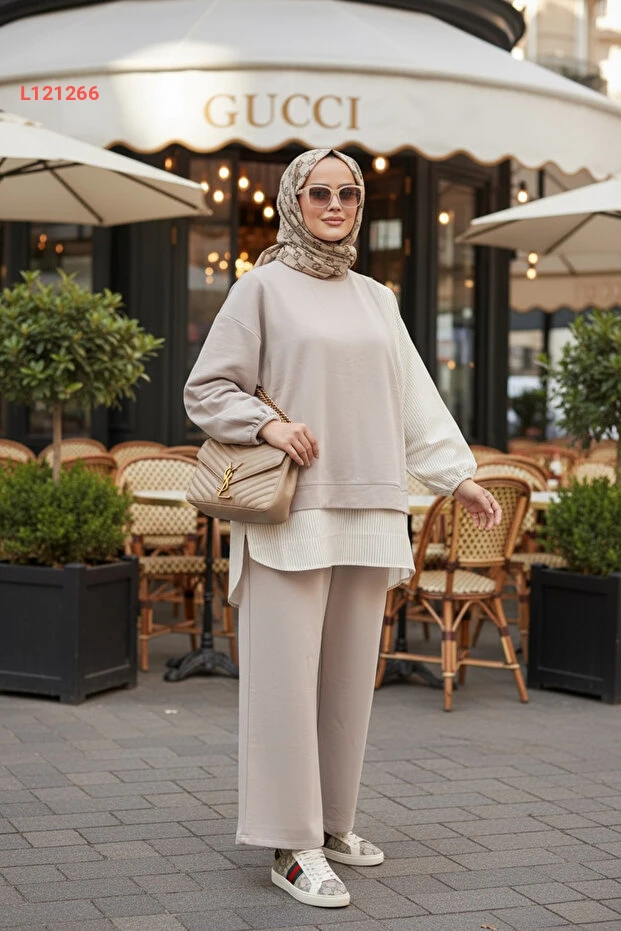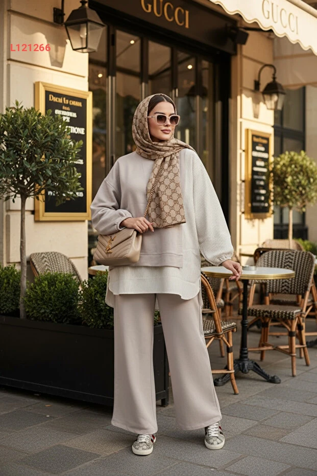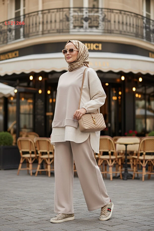 اكتشفي أناقة لا مثيل لها مع طقم أسليم المكون من بلوزة طويلة وتونيك بتفاصيل خطوط أنيقة. يتميز هذا التصميم باللون البيج الجذاب والسروال الواسع مع جيوب عملية، مما يجعله الخيار المثالي لإطلالة مريحة وعصرية في مختلف المناسبات. ارتديها واستمتعي بالأناقة والراحة في كل خطوة!