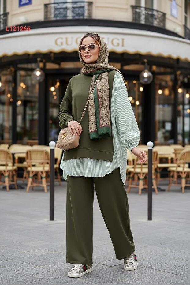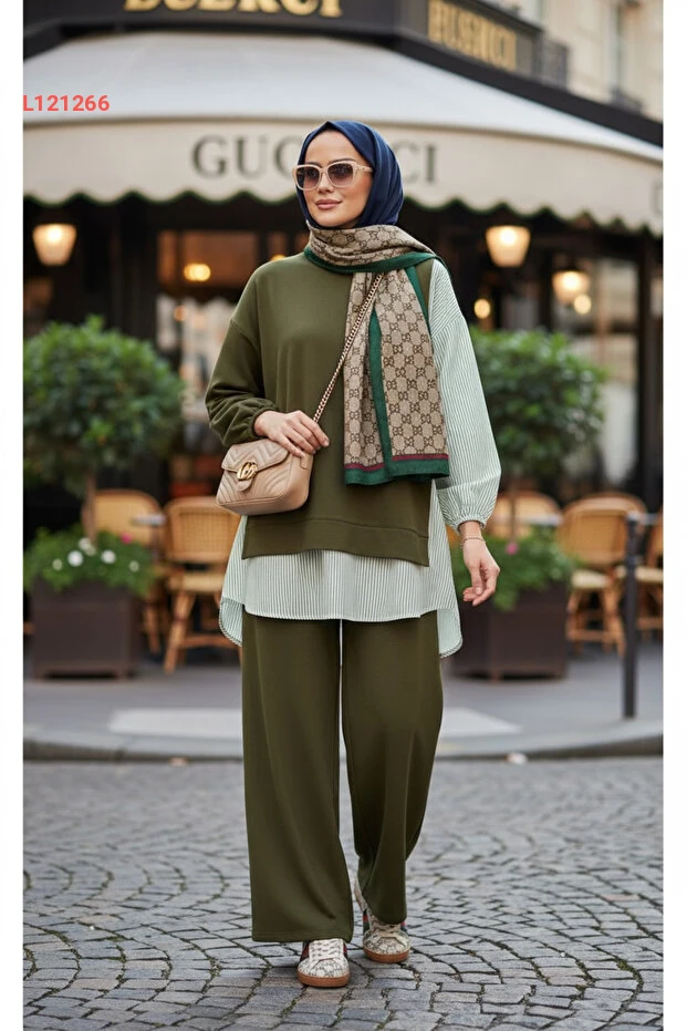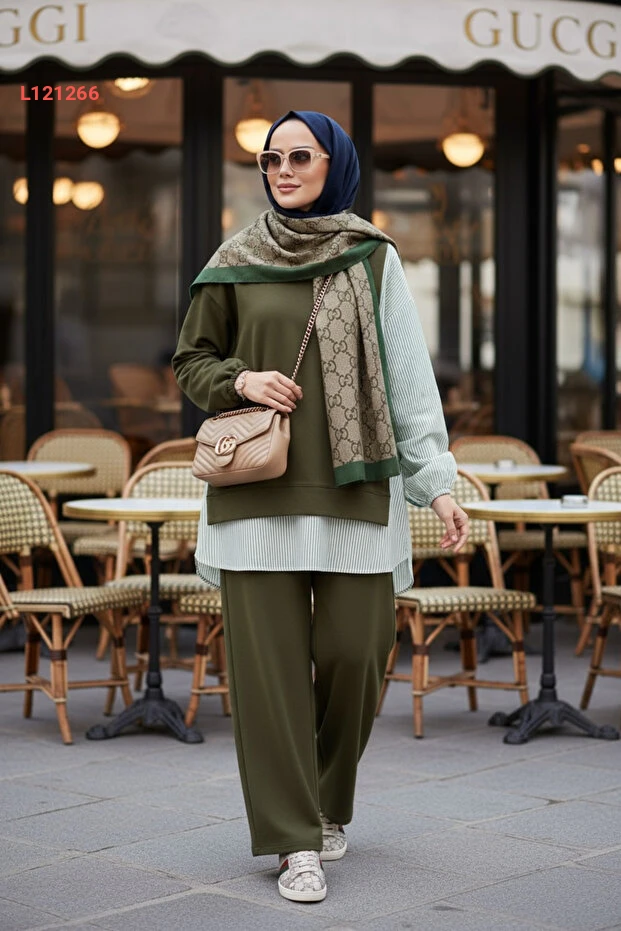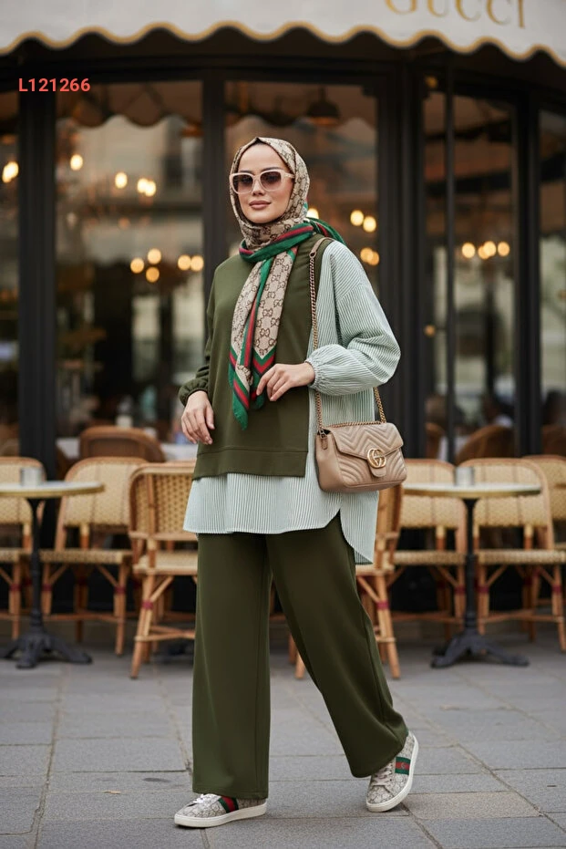 استمتع بالأناقة والراحة مع طقم "Aselim Hijap Moda" المكون من tunic وبلوزة، حيث يتميز بتصميمه العصري ذو الخطوط الأنيقة والجيوب العملية، مما يجعله خيارًا مثاليًا لإطلالة متنوعة ومميزة. بفضل بنطالته الواسعة، يوفر لك حرية الحركة وأناقة في كل مناسبة، بينما يضفي اللون الأخضر لمسة من الحيوية على مظهرك.