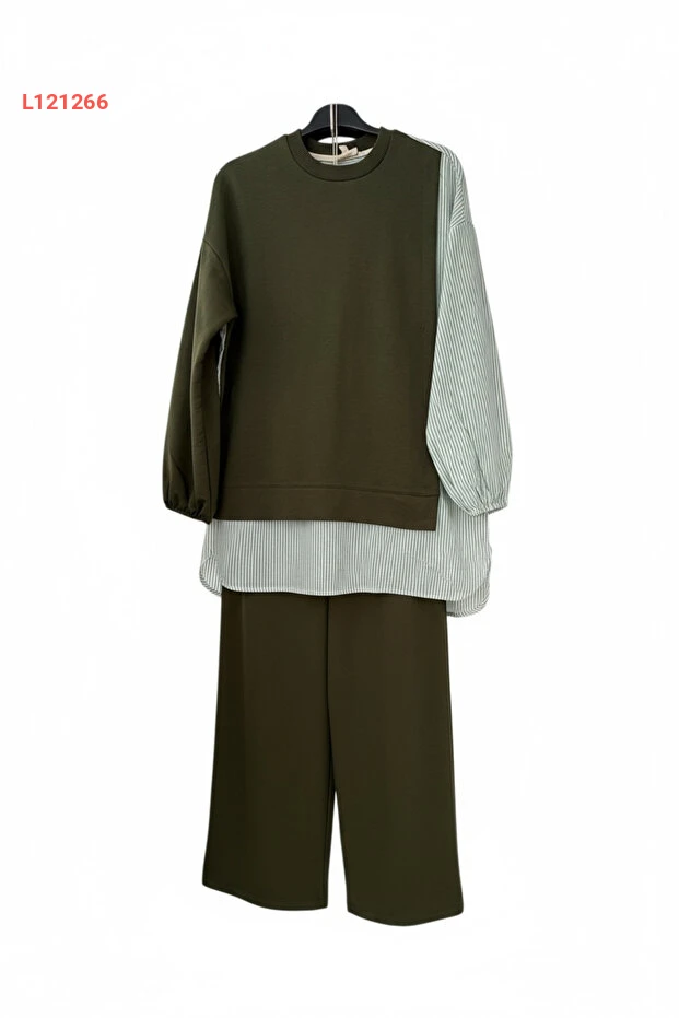 طقم أسليم المخطط بأكمام طويلة وتونيك أخضر بسراويل واسعة جيوب