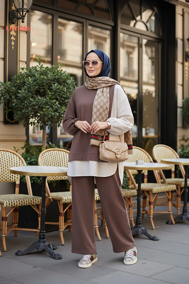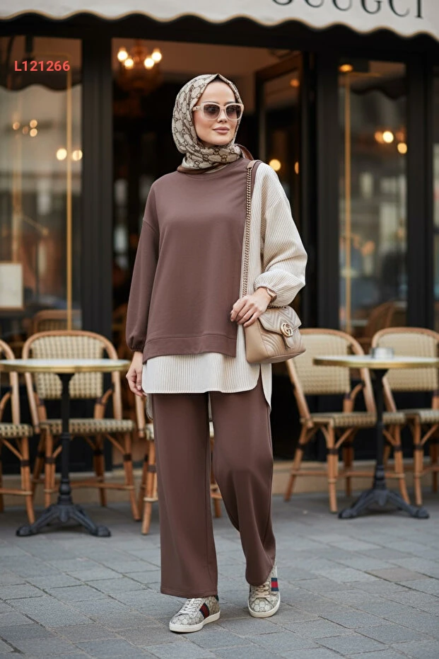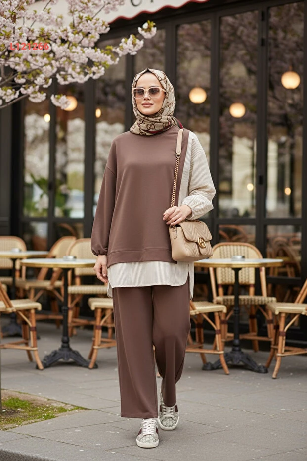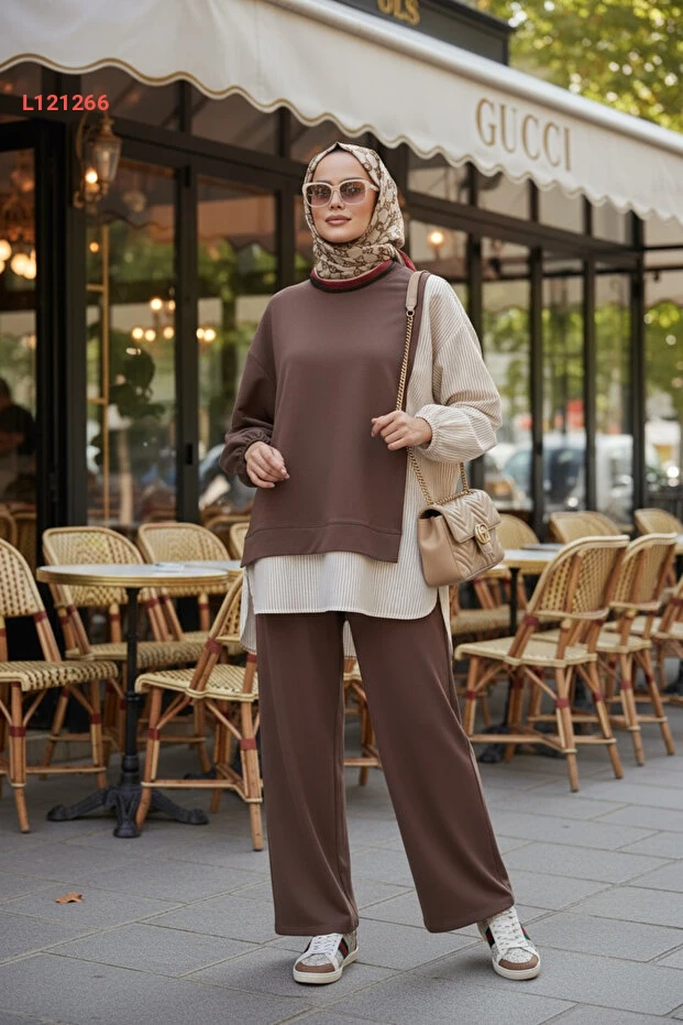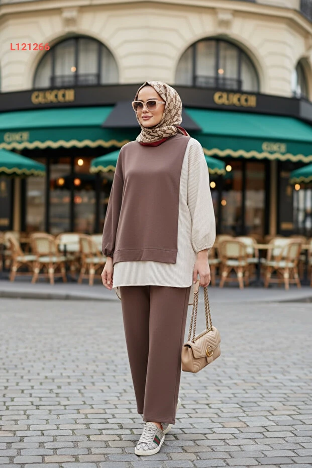 استمتعي بأناقة لا تضاهى مع طقم "Aselim" المكون من قميص مخطط وتونيك بقصّة عصرية. يتميز هذا الطقم بأكمامه الطولية وجيوبه العملية، بالإضافة إلى سراويل واسعة مريحة، مما يجعله خيارًا مثاليًا لأيامك اليومية والمناسبات. تميزي بإطلالة أنيقة تجمع بين البساطة والراحة بلون بني جذاب يتناسب مع جميع الأذواق.