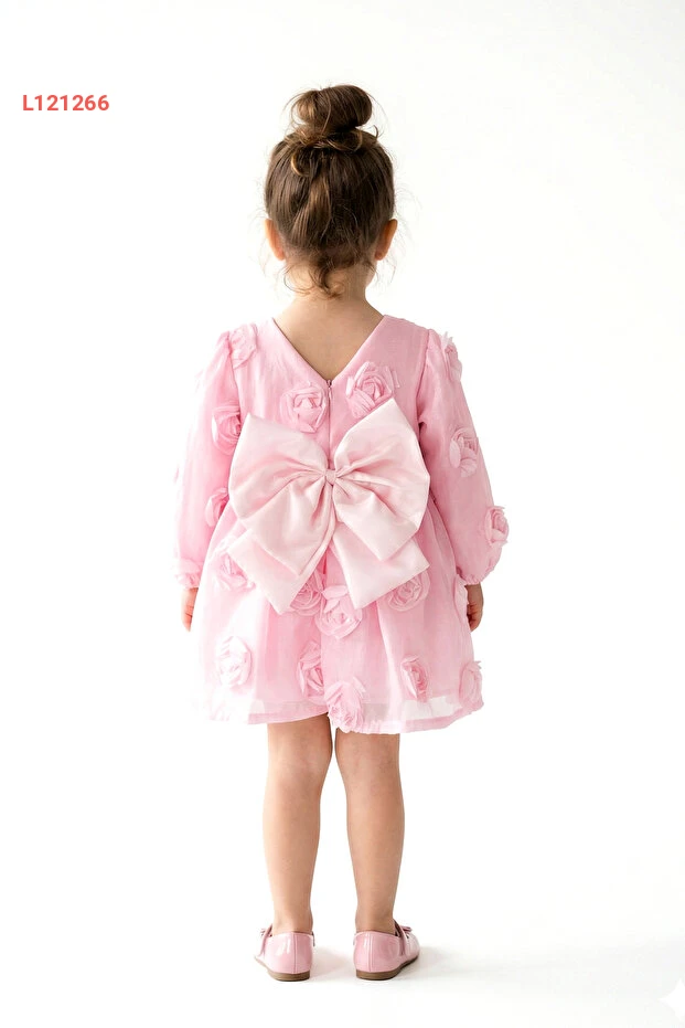 فستان بنت صغيرة مزين بالورود للمناسبات الخاصة والأعياد مع أكمام طويلة وعقال مزخرف