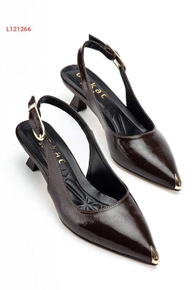 حذاء كعب قصير باحتواء جذاب من الجلد اللامع بلون بني غامق للنساء