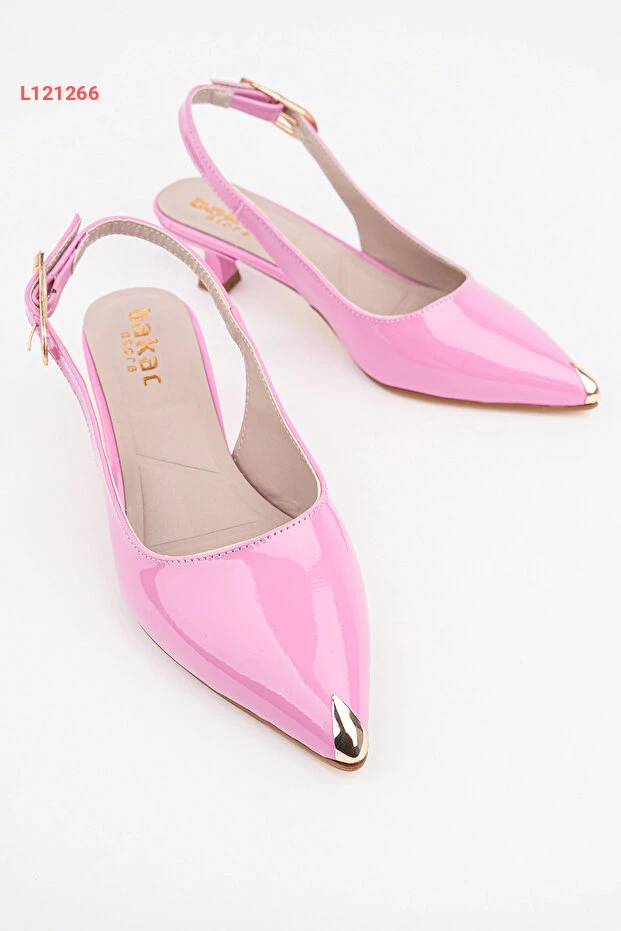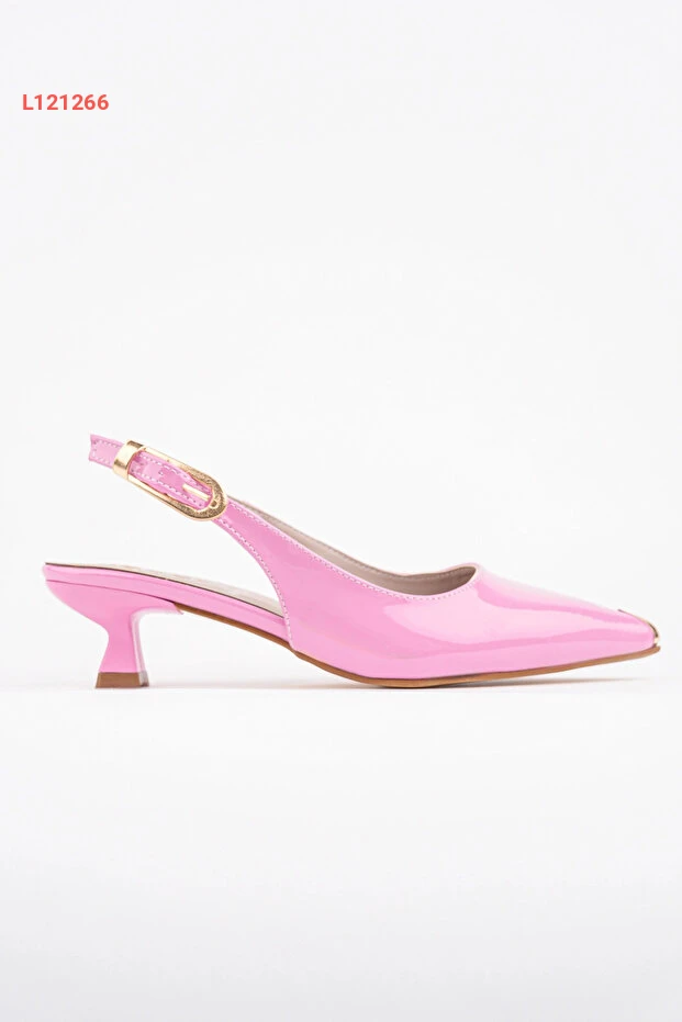 حذاء كعب قصير نسائي باللون الوردي اللامع مع تفاصيل أنيقة