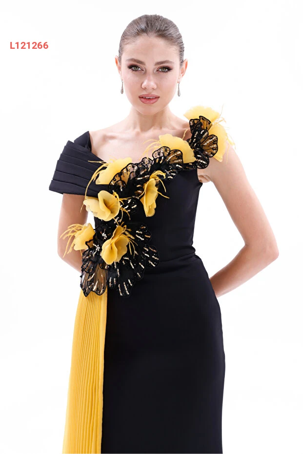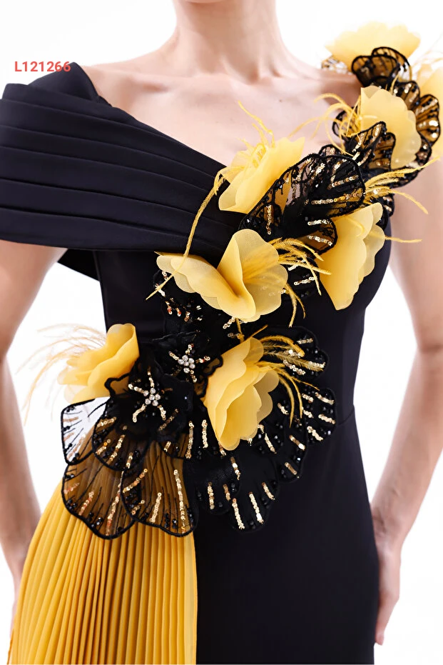 فستان سهرة طويل كريب بتفاصيل زهور دَلِيمة بأكمام غير متساوية من ب.دي.م. إكسكلسيف