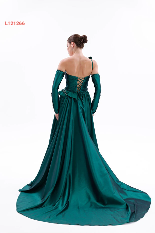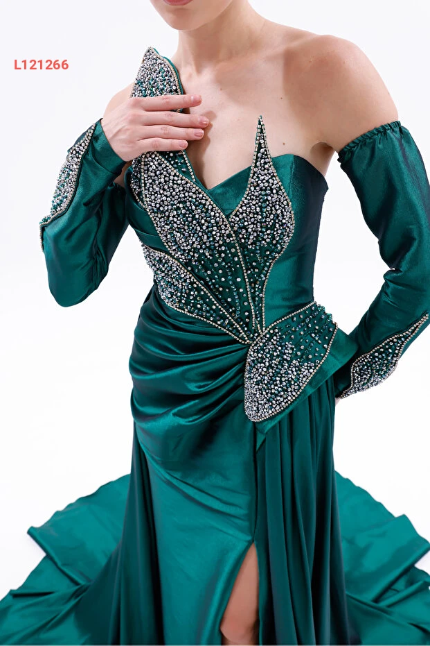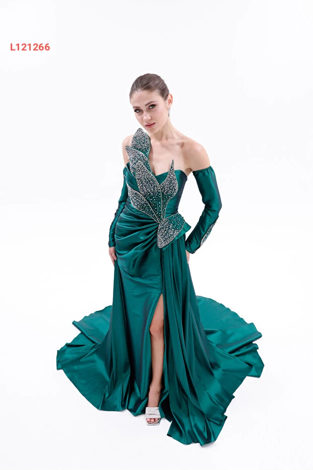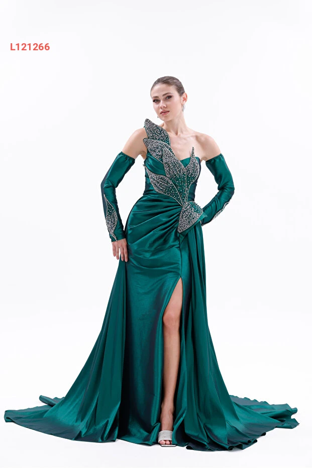 BDM Exclusive Taş İşlemeli Yaprak Detaylı Drapeli Tafta Abiye Elbise