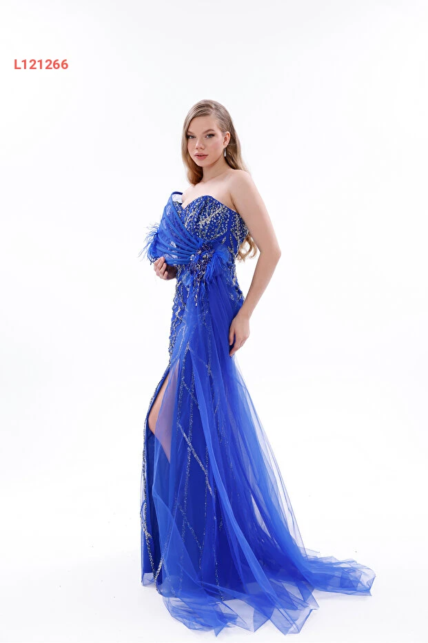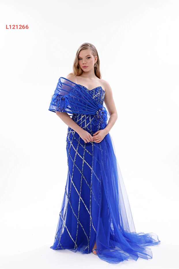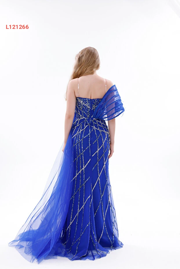 BDM Exclusive Tek Omuz Tül Drapeli Kristal İşlemeli Yırtmaçlı Mavi Şifon Abiye Elbise