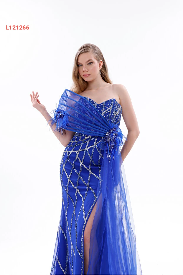 BDM Exclusive Tek Omuz Tül Drapeli Kristal İşlemeli Yırtmaçlı Mavi Şifon Abiye Elbise عالي الجودة. مثالي للاستخدام اليومي مع متانة وتصميم ممتاز.