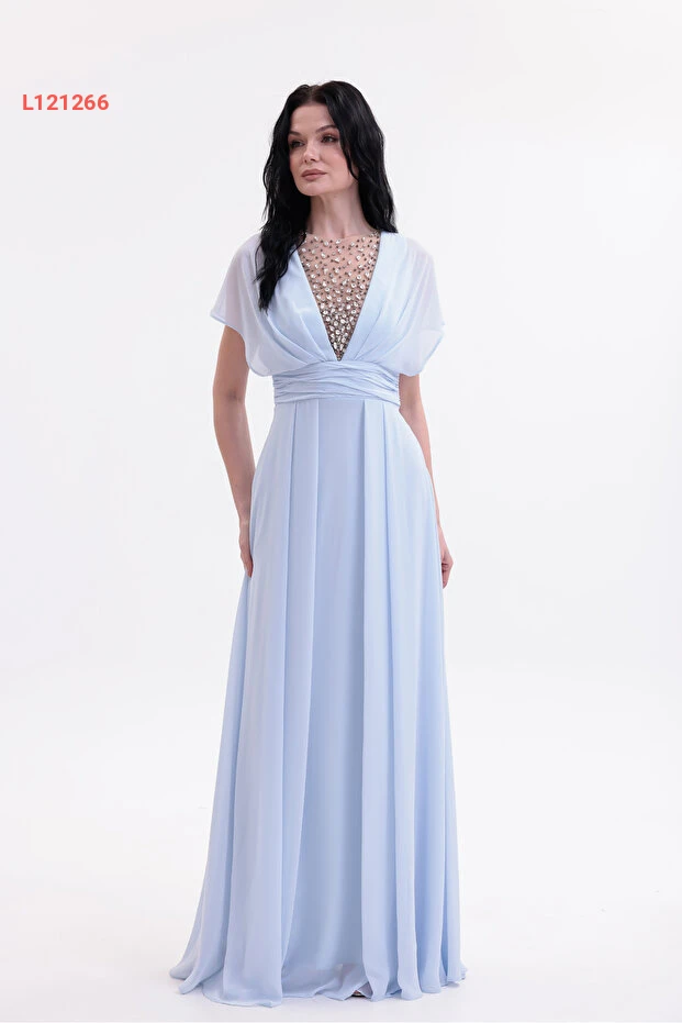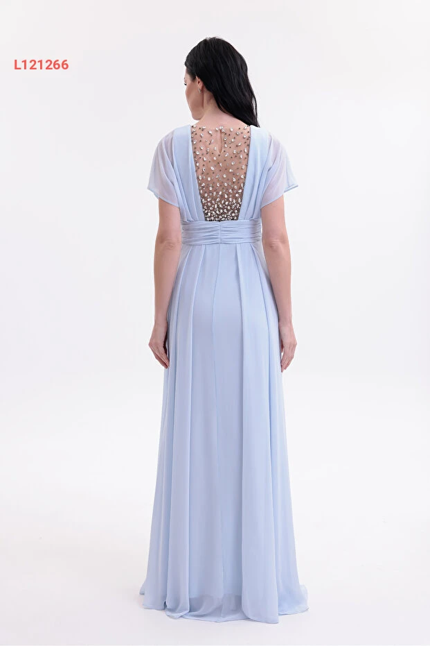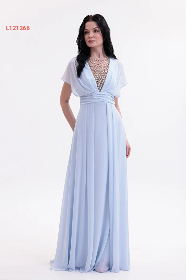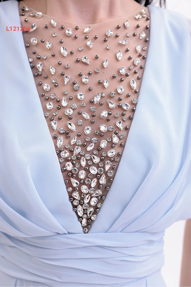 فستان سهرة طويل بتفاصيل حجرية وتطريز رائع من الشيفون والكريب