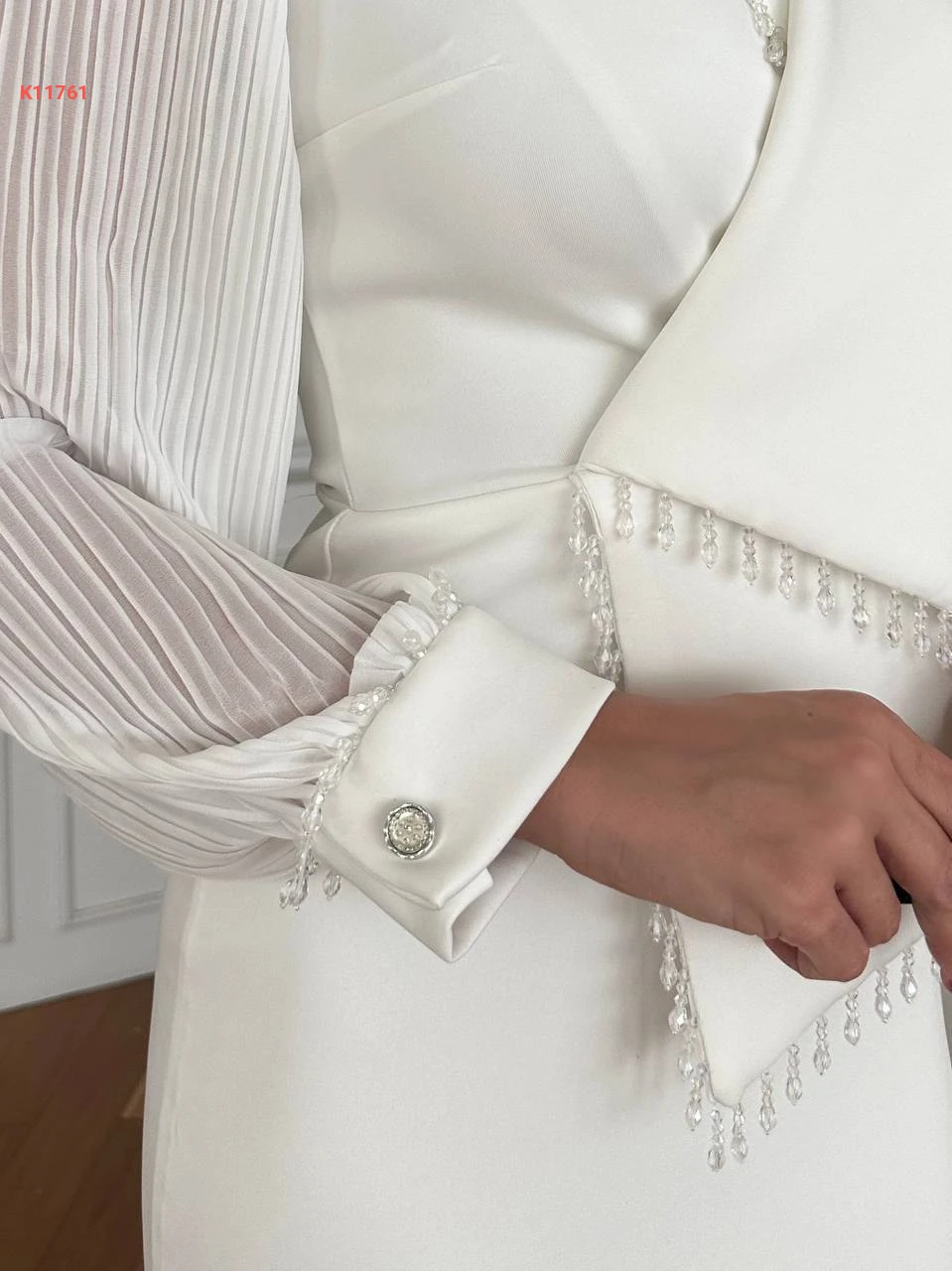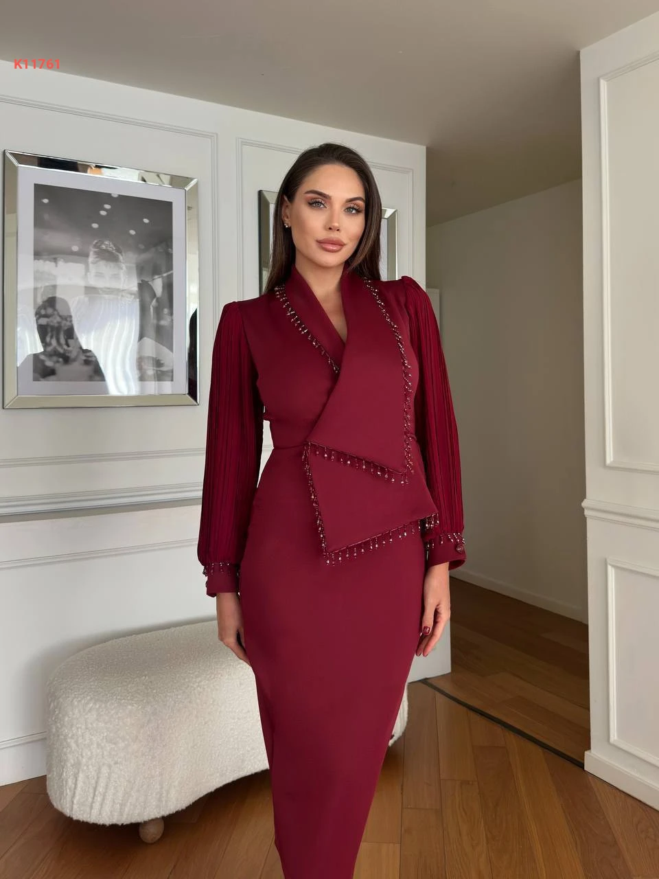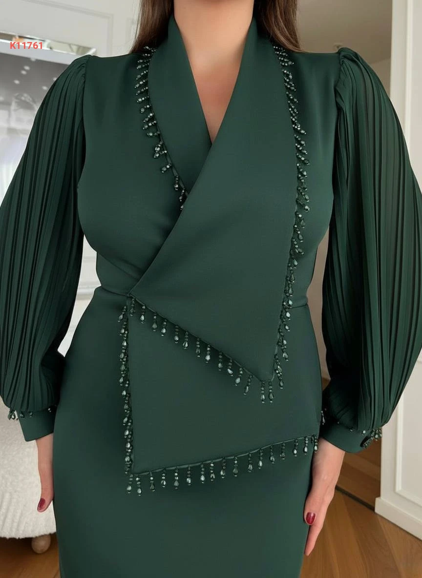 فستان مطرز خرز بأكمام بليسيه