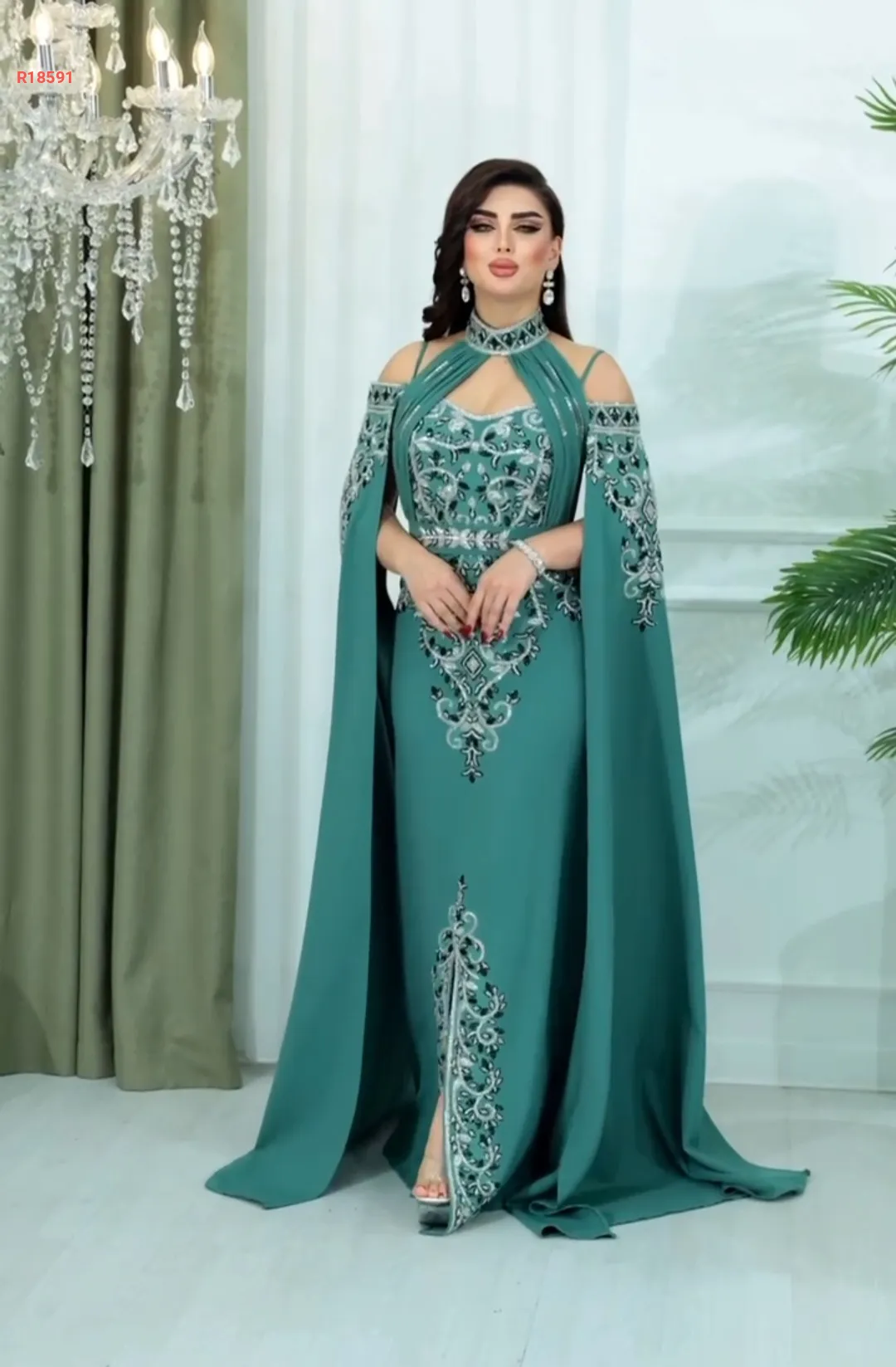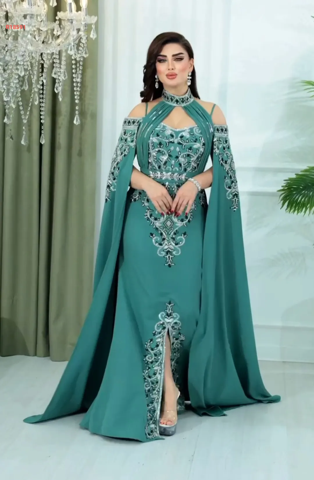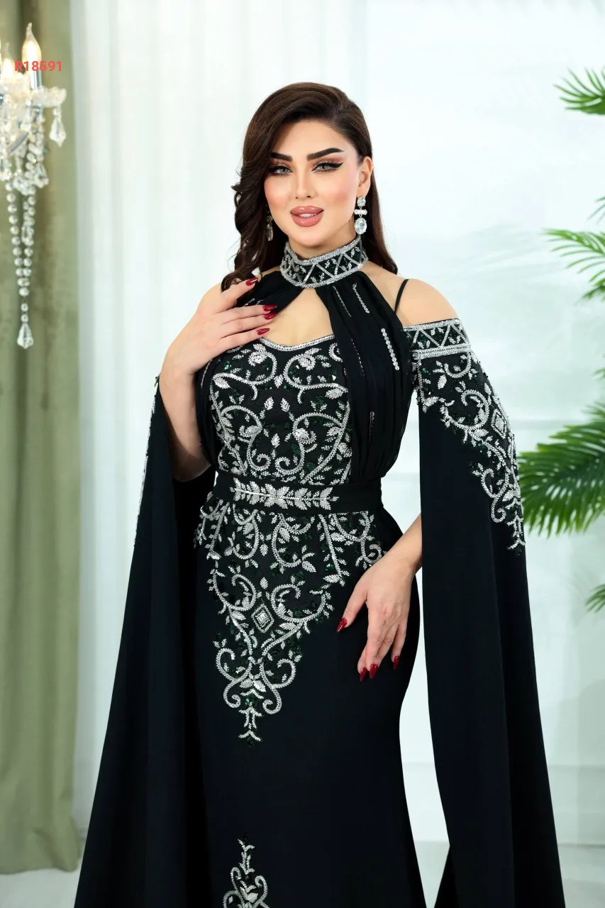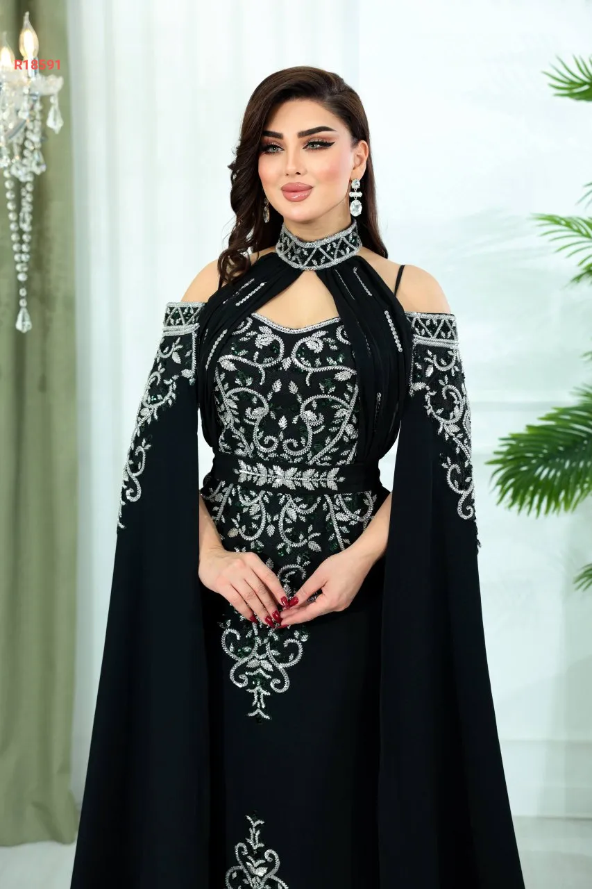 تفاصيل فاخرة بتطريز خرز وسيلان، وسحبات تكسير وزمّ من الصدر للرقبة تضيف فخامة ملوكية.