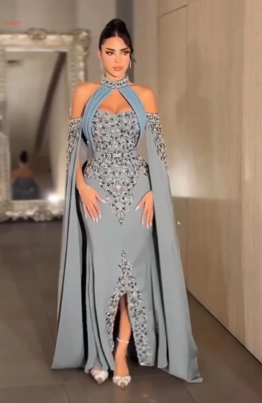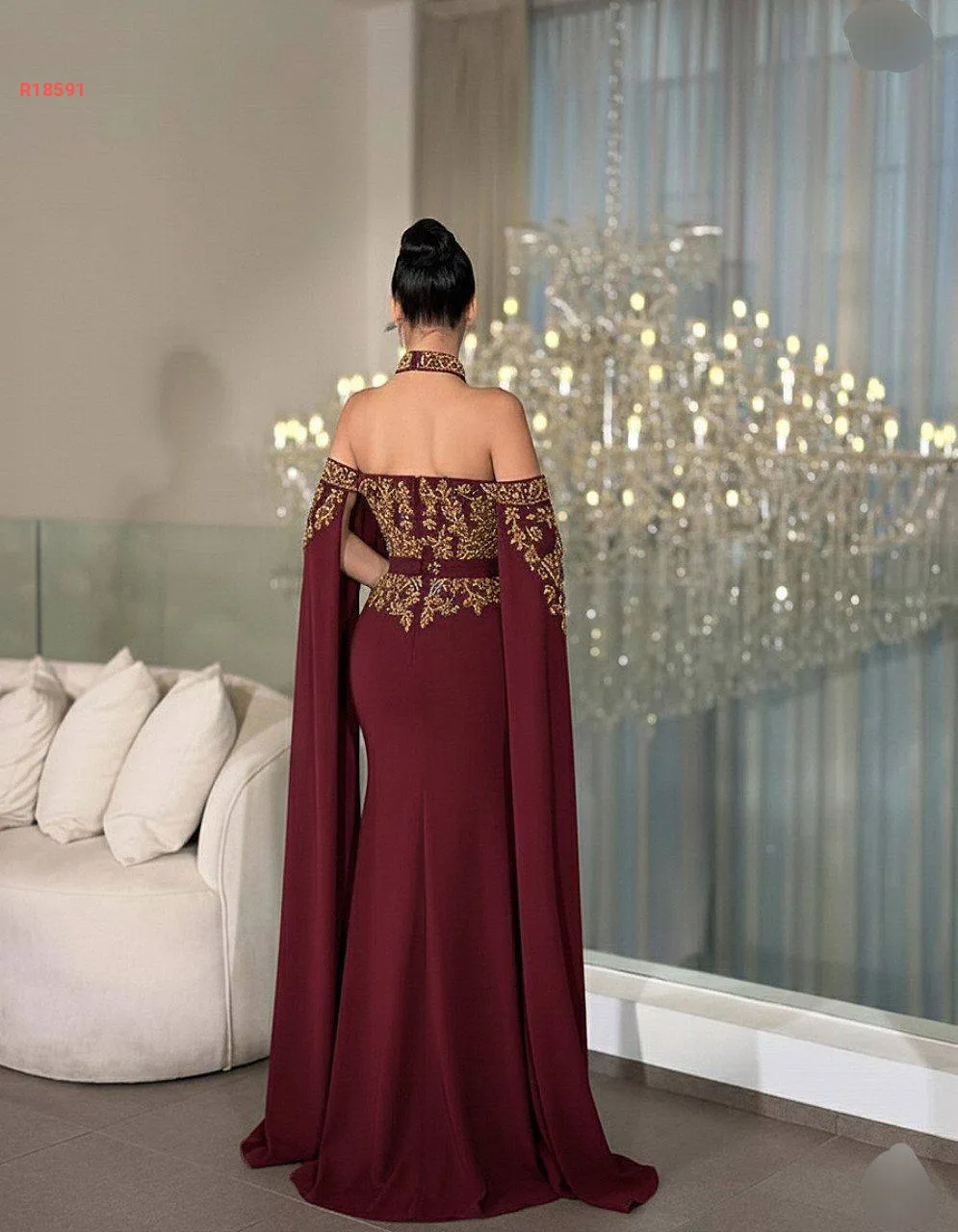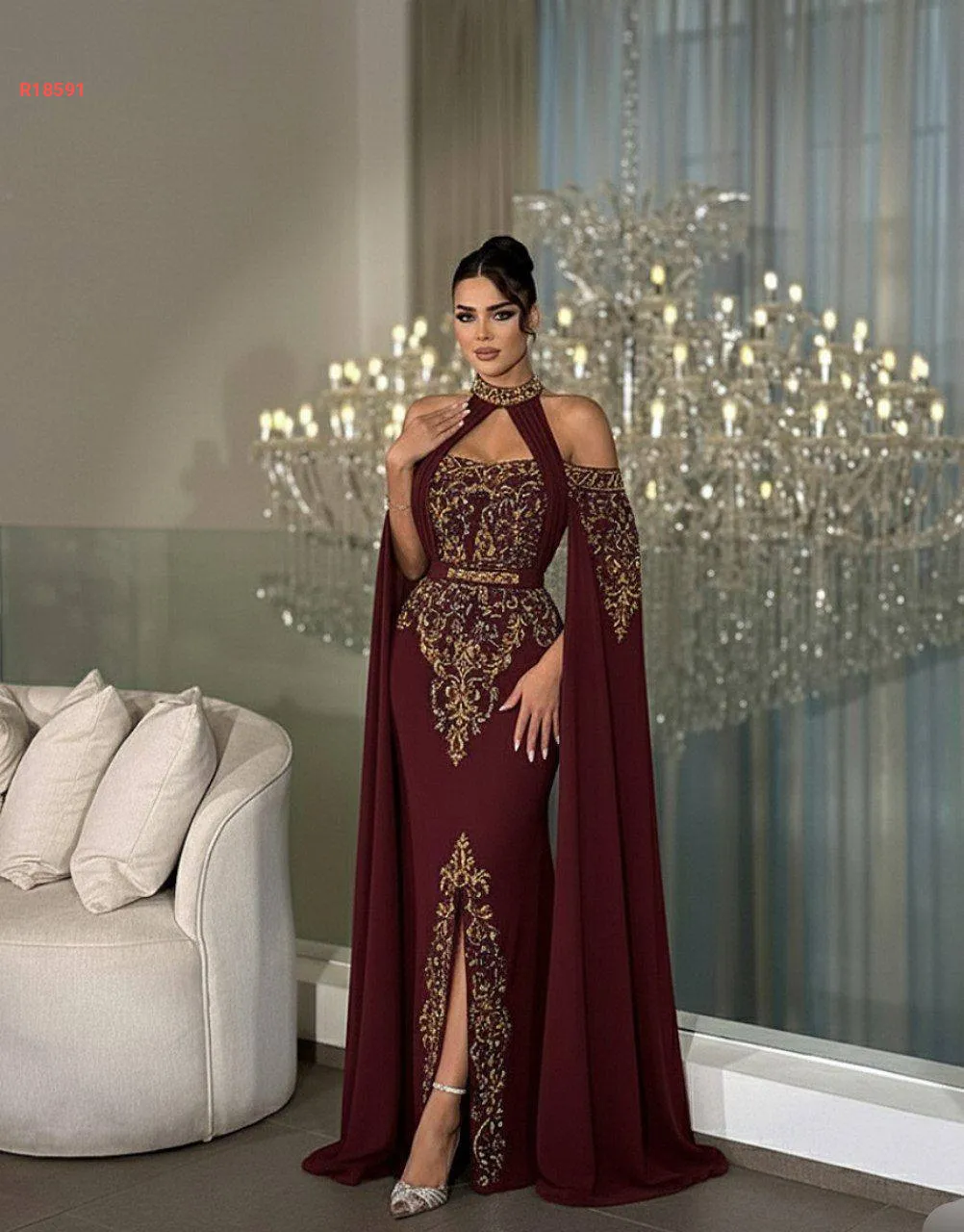 تفاصيل فاخرة بتطريز خرز وسيلان، وسحبات تكسير وزمّ من الصدر للرقبة تضيف فخامة ملوكية.