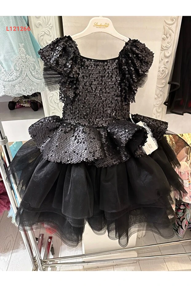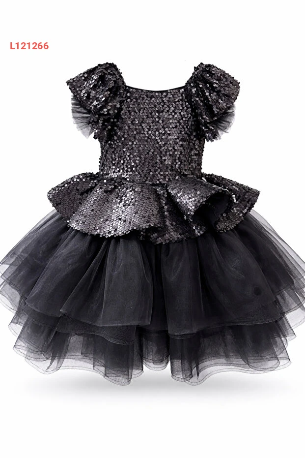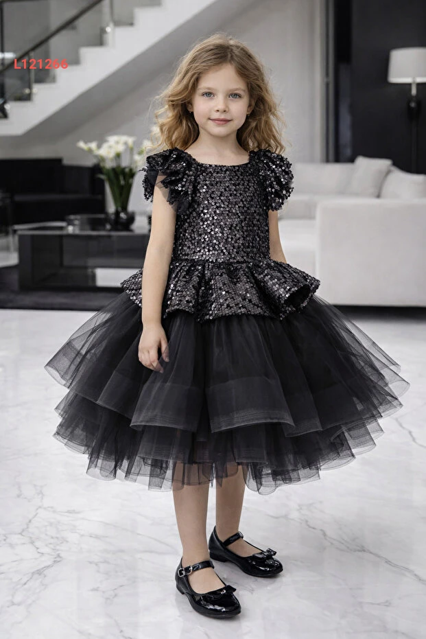 فستان تخرج بناتي من التُل المطرّز بالمرايا - أبيض-أزرق-أسود، للأعمار من 2-12 سنة