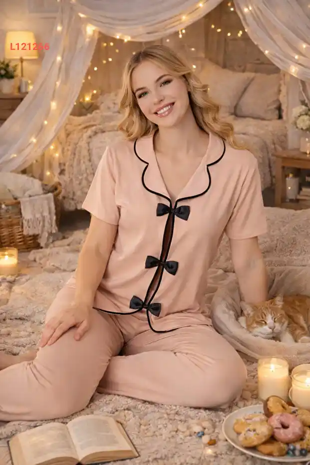 استمتع بنوم هانئ مع طقم بيجاما BELLA NOTTE المصنوع من القطن الناعم، الذي يتميز بتصميمه الأنيق مع نقوش الورد الربيعية وأشرطة الفيونك الجذابة. يضمن لك هذا الطقم الراحة والحرية في الحركة، مما يجعله الخيار المثالي لأمسياتك المريحة أو ساعات النوم الطويلة. ارتدي الأناقة مع الراحة في كل زاوية من زوايا منزلك!