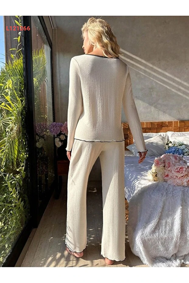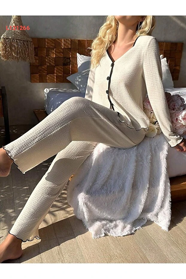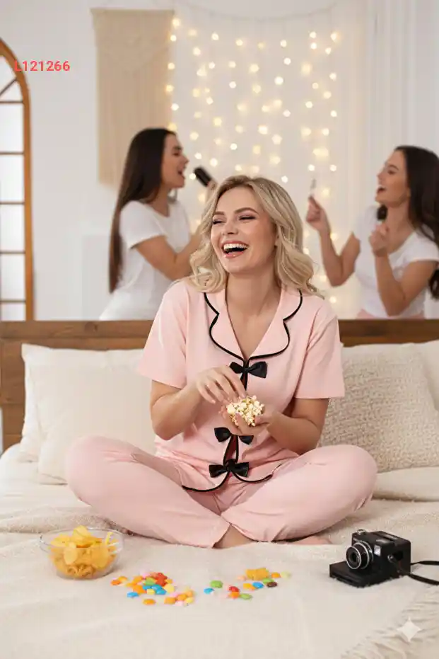 استمتع بليالي مريحة مع طقم البيجاما الطويل "BELLA NOTTE". يتميز بتصميم V یاقة أنيق وأزرار تزيينية تضيف لمسة من الأنوثة، بينما يوفر القماش الناعم الراحة المطلقة لبشرة خالية من أي تهيج. مع هذا الطقم، ستشعرين بالأناقة والراحة في كل لحظة من لحظات نومك.
