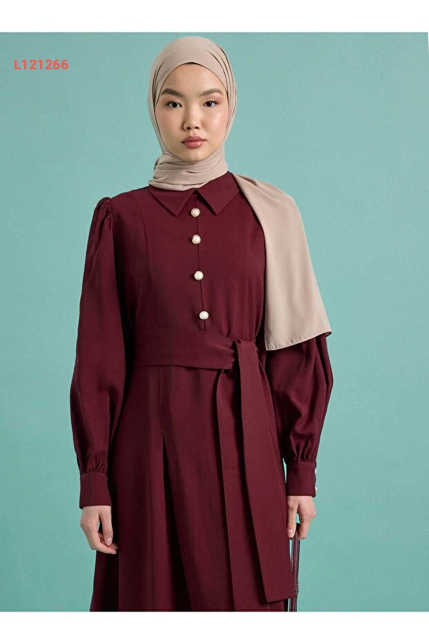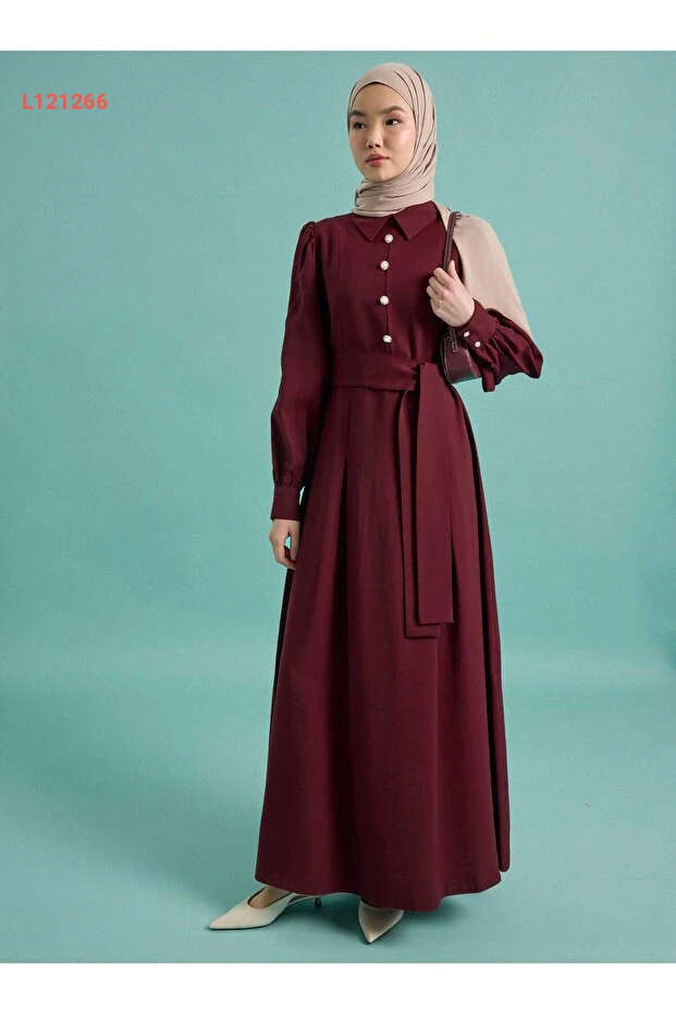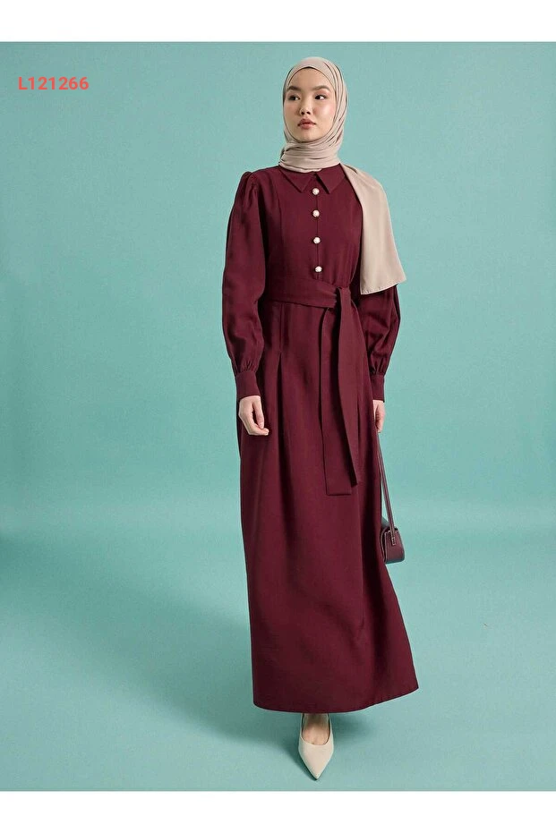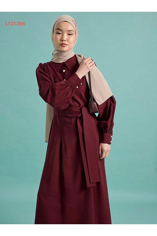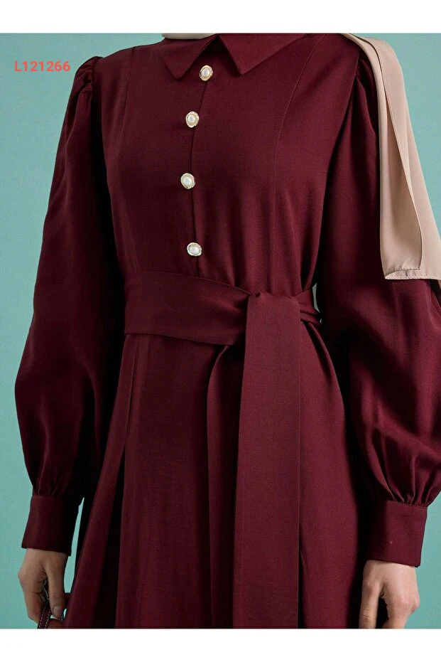 فستان تسبيح مزين بأزرار مع أكمام بالون وحزام - بورغندي
