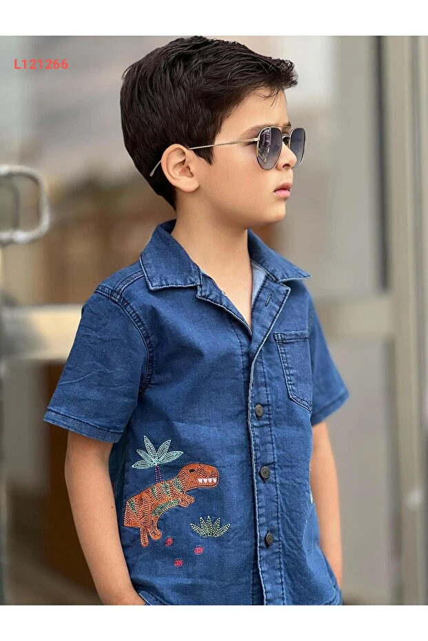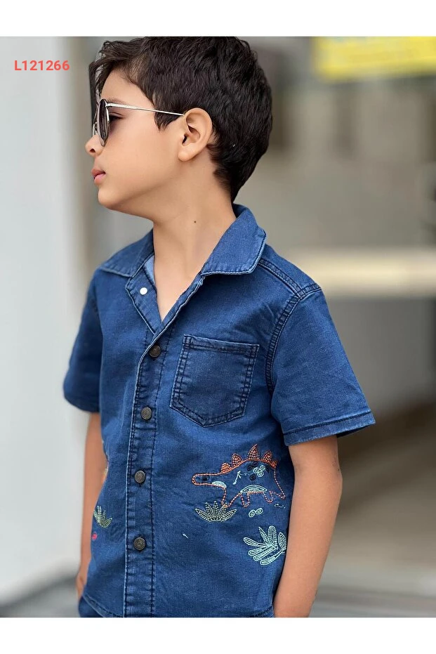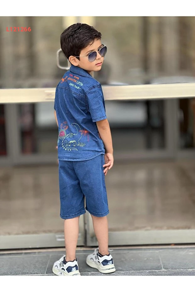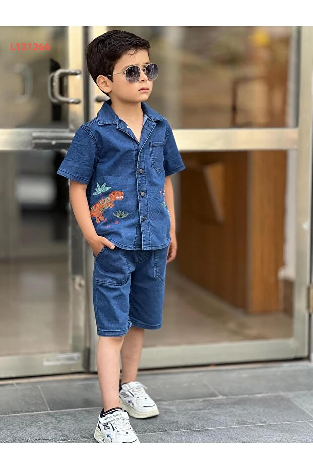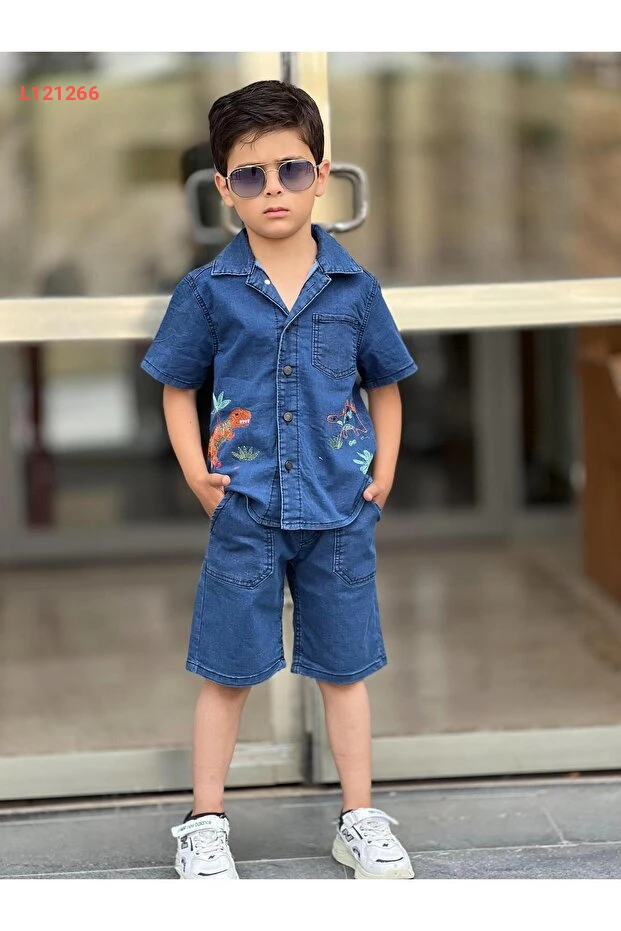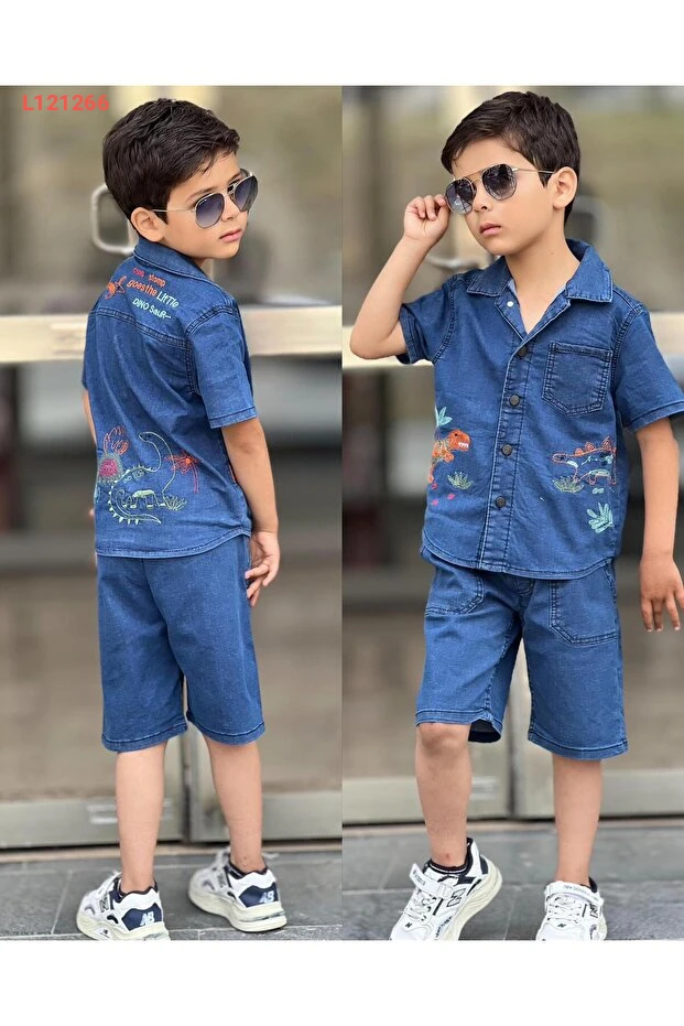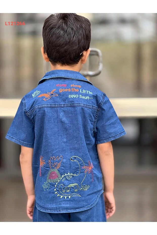 مجموعة صيفية للأطفال الأولاد بتصميم ديناصور مطرّز (شورت وقميص) من بيرفونزو