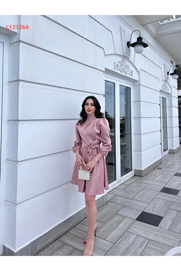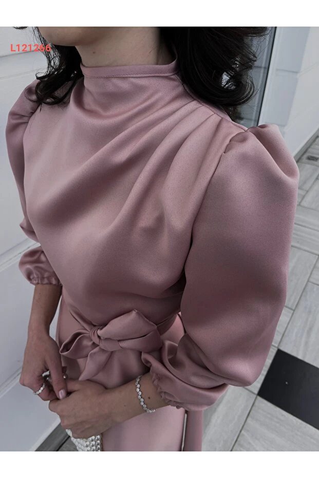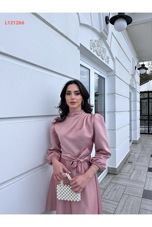 فستان بيزاتوران بزهرة الورد بتصميم كلاسيكي أكمام طويلة وتنورة واسعة مع تفاصيل تجاعيد على الكتف