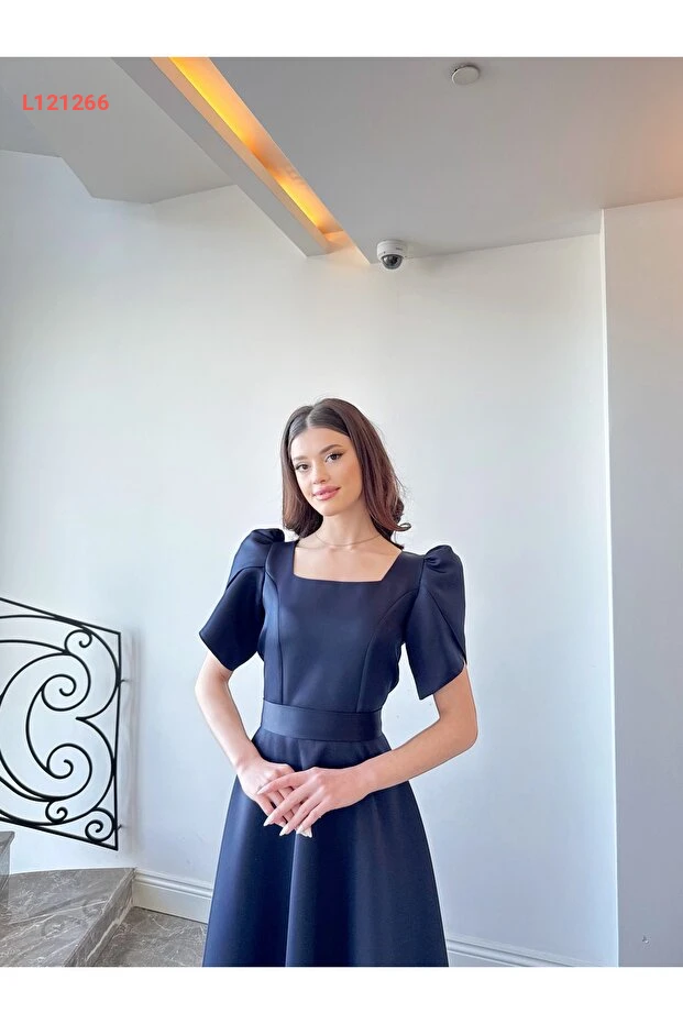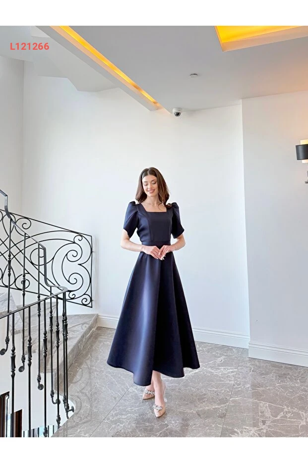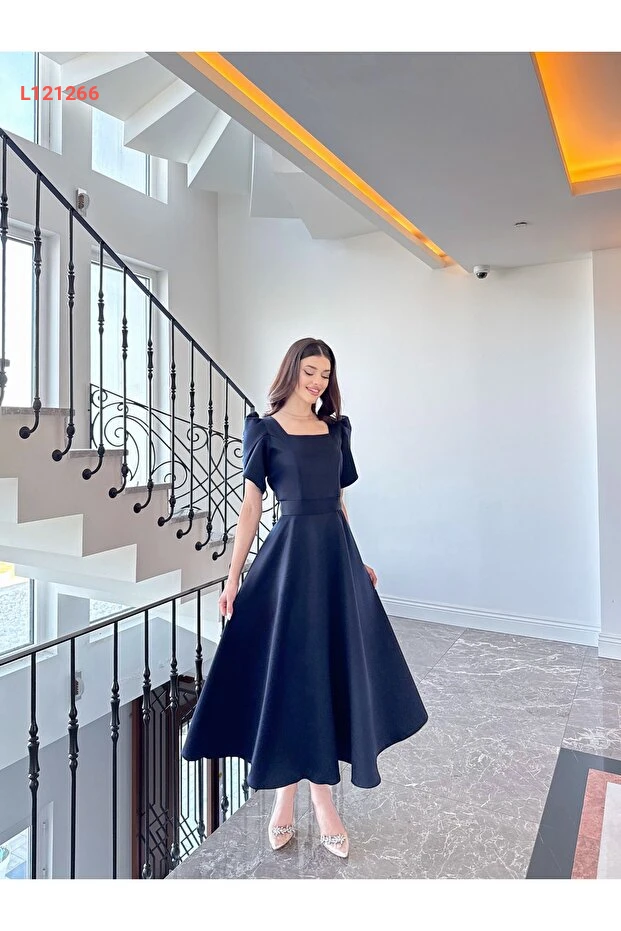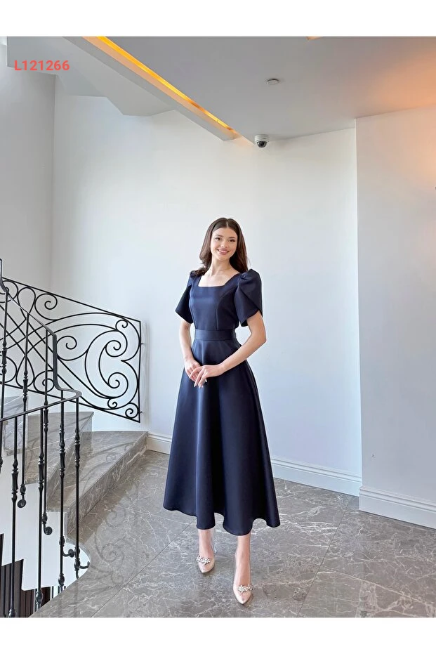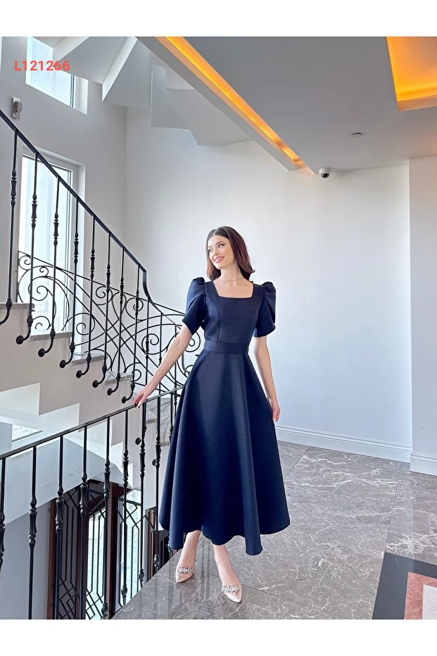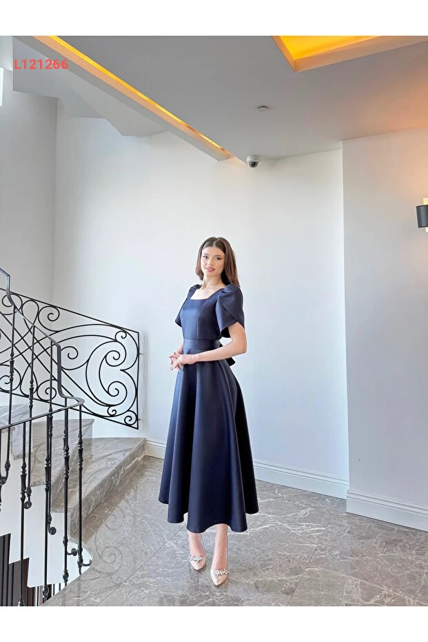 فستان ماكسي أنيق بكم قصير بلون أزرق داكن مع تنورة واسعة