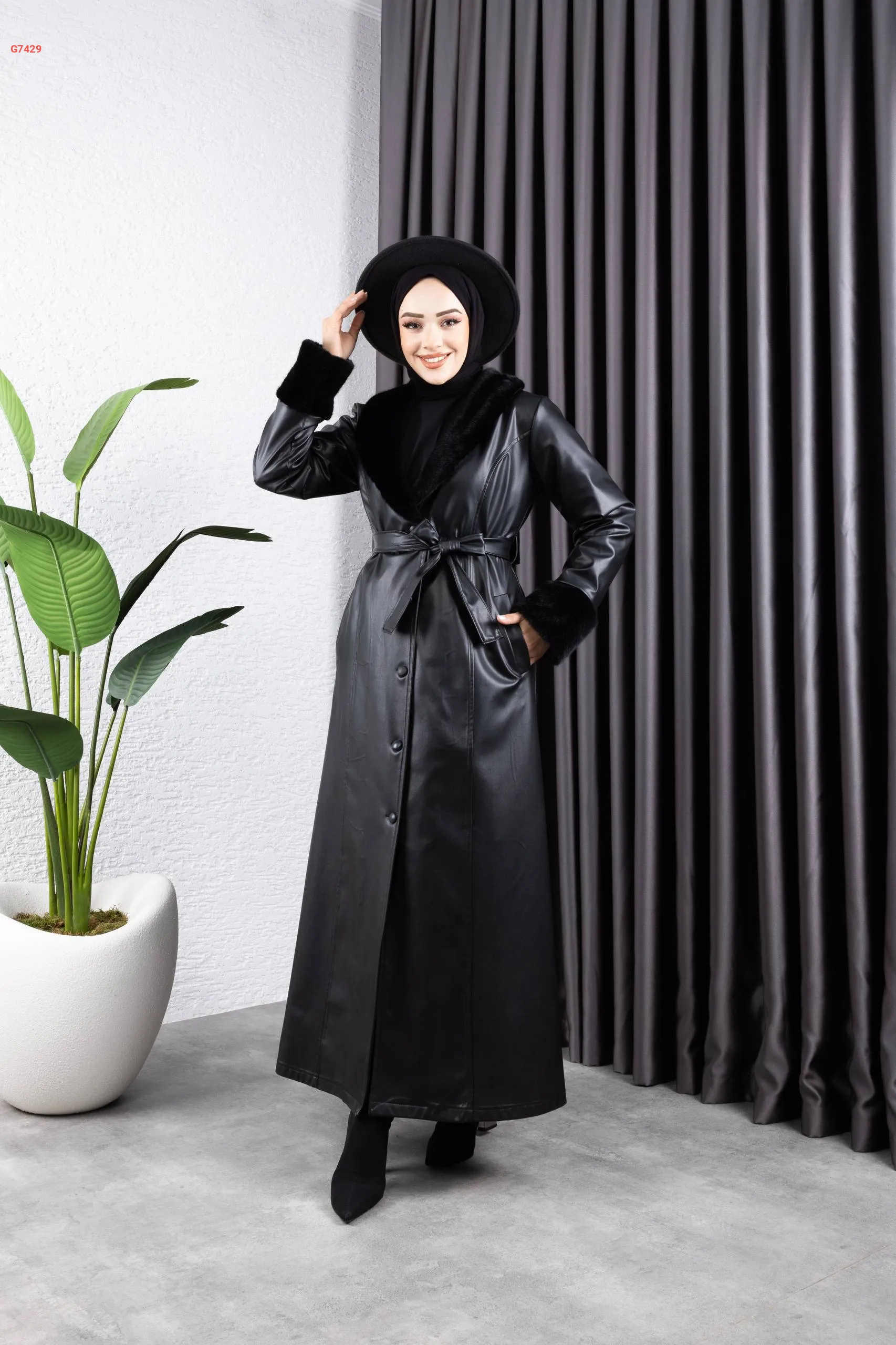 مانطو جلد بأزرار ، مع حزام ، بياقة وأكمام فرو ، مع جيب , مقاسات كبيرة