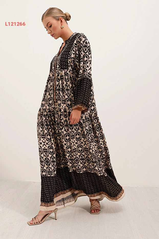 فستان تسليم طويل للنساء بتصميم أسود وبيج من قماش فيسكوز