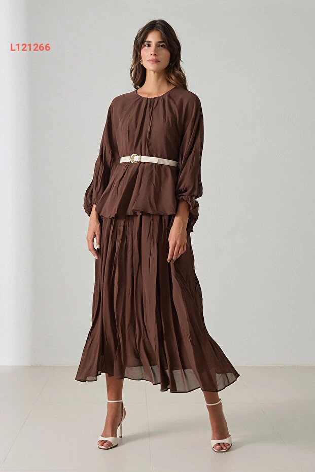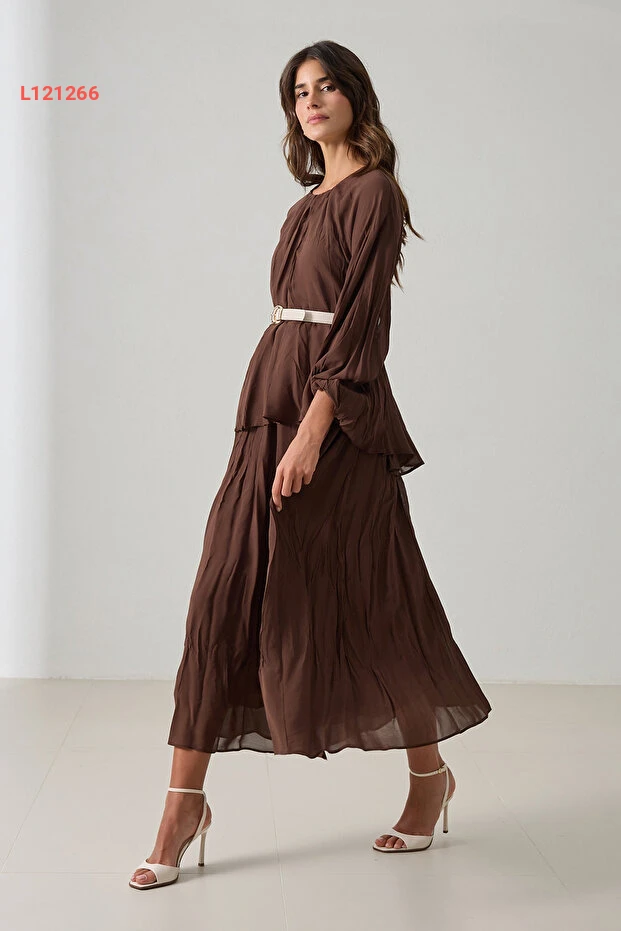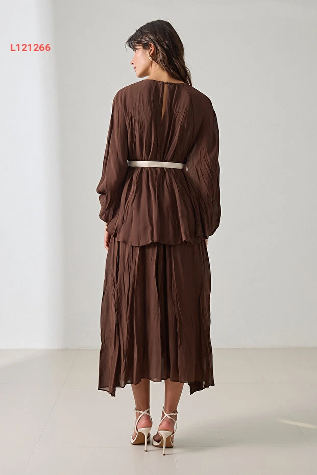 فستان ميدي طويل بأكمام واسعة ولون بني داكن مع حزام للخصر