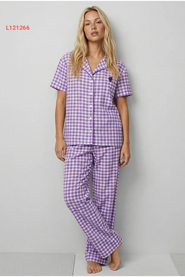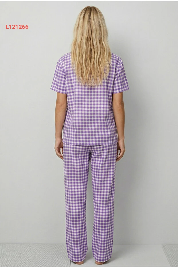 بيجامة سوفت مزخرفة بأزرار ومربعات بنفسجية - لؤلؤة سوداء 8001