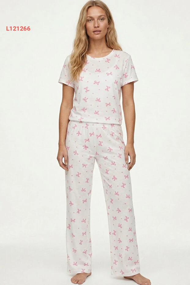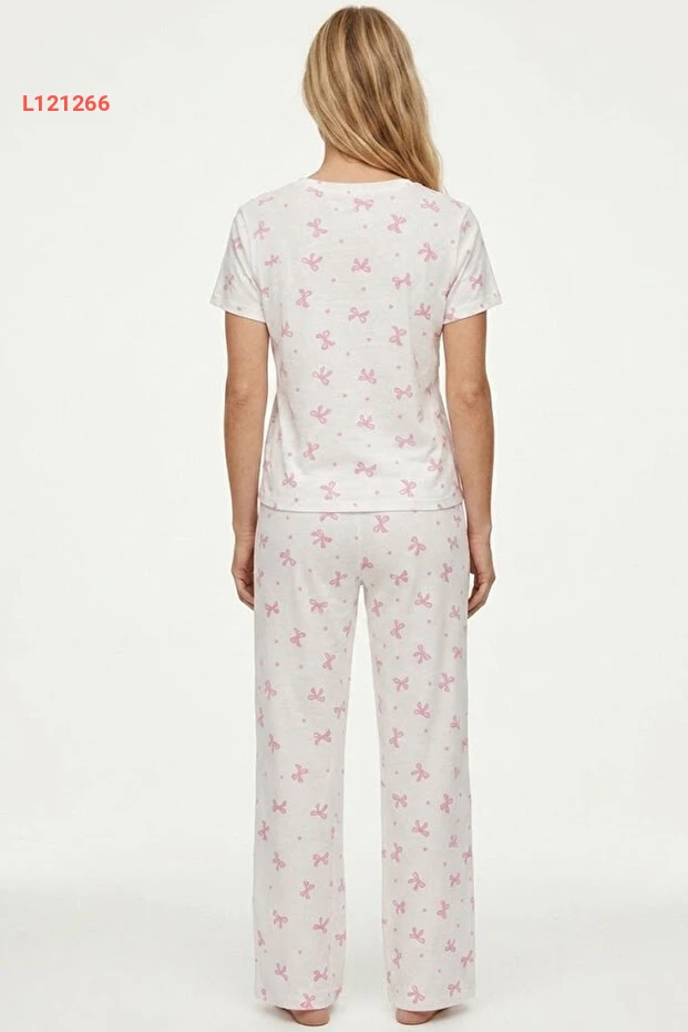 بدلة بيجاما ناعمة مزينة برباط أبيض من اللؤلؤ الأسود 8003