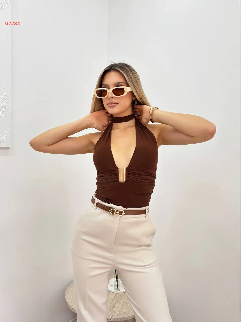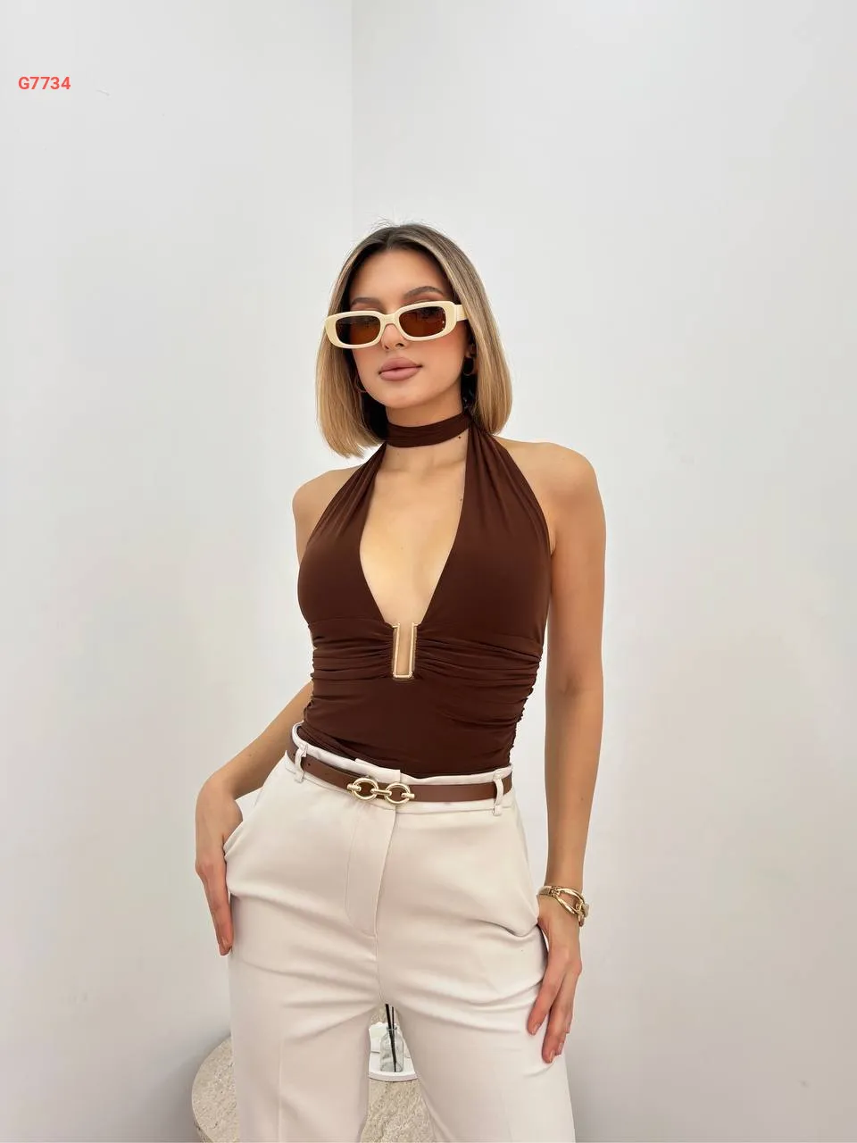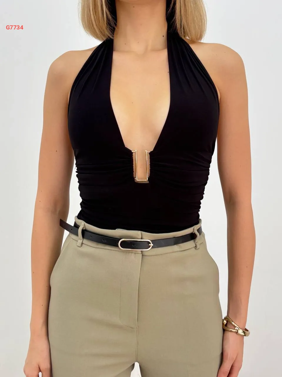 بلوزة بربطة خلفية عالرقبة وإبزيم