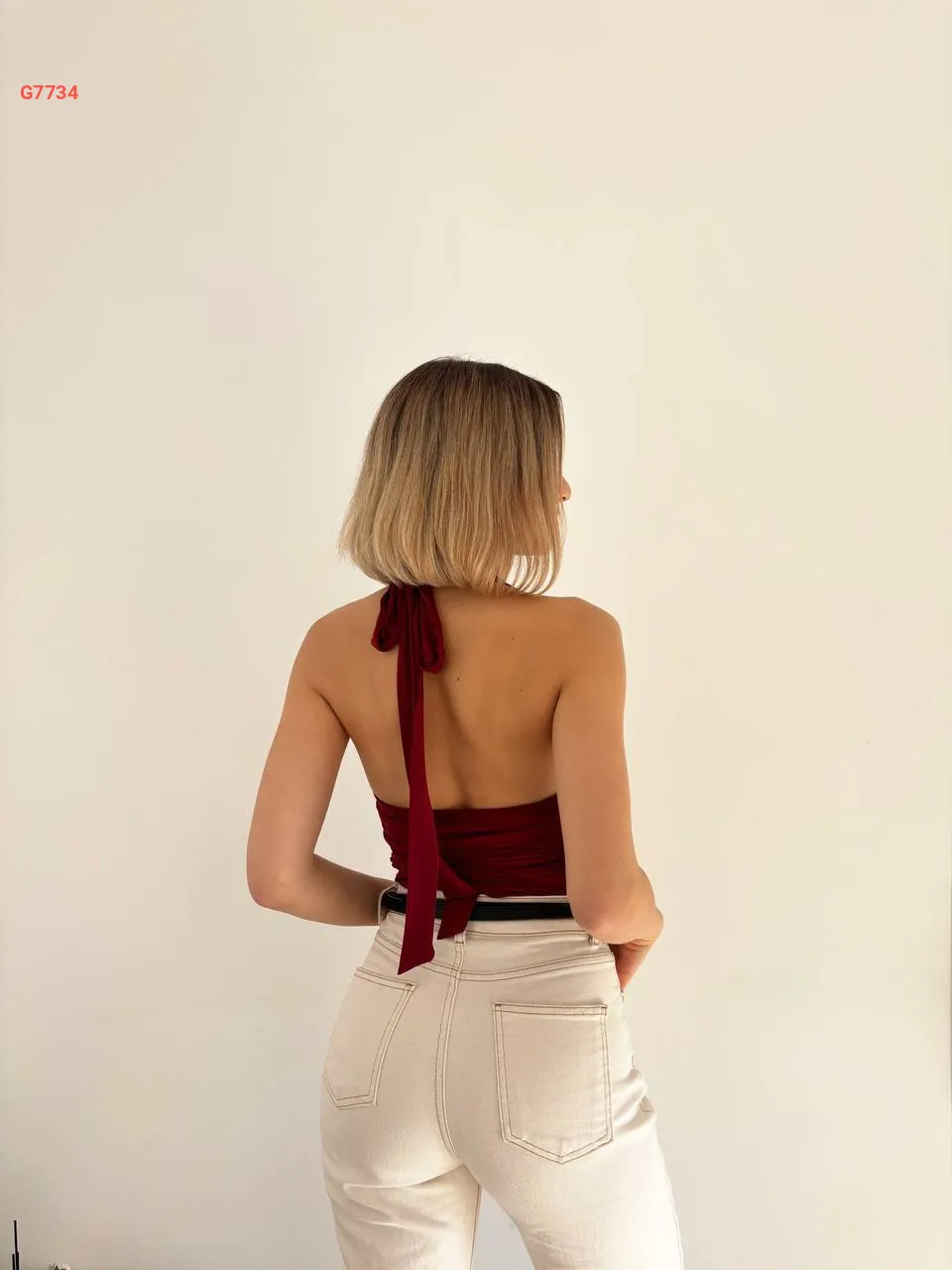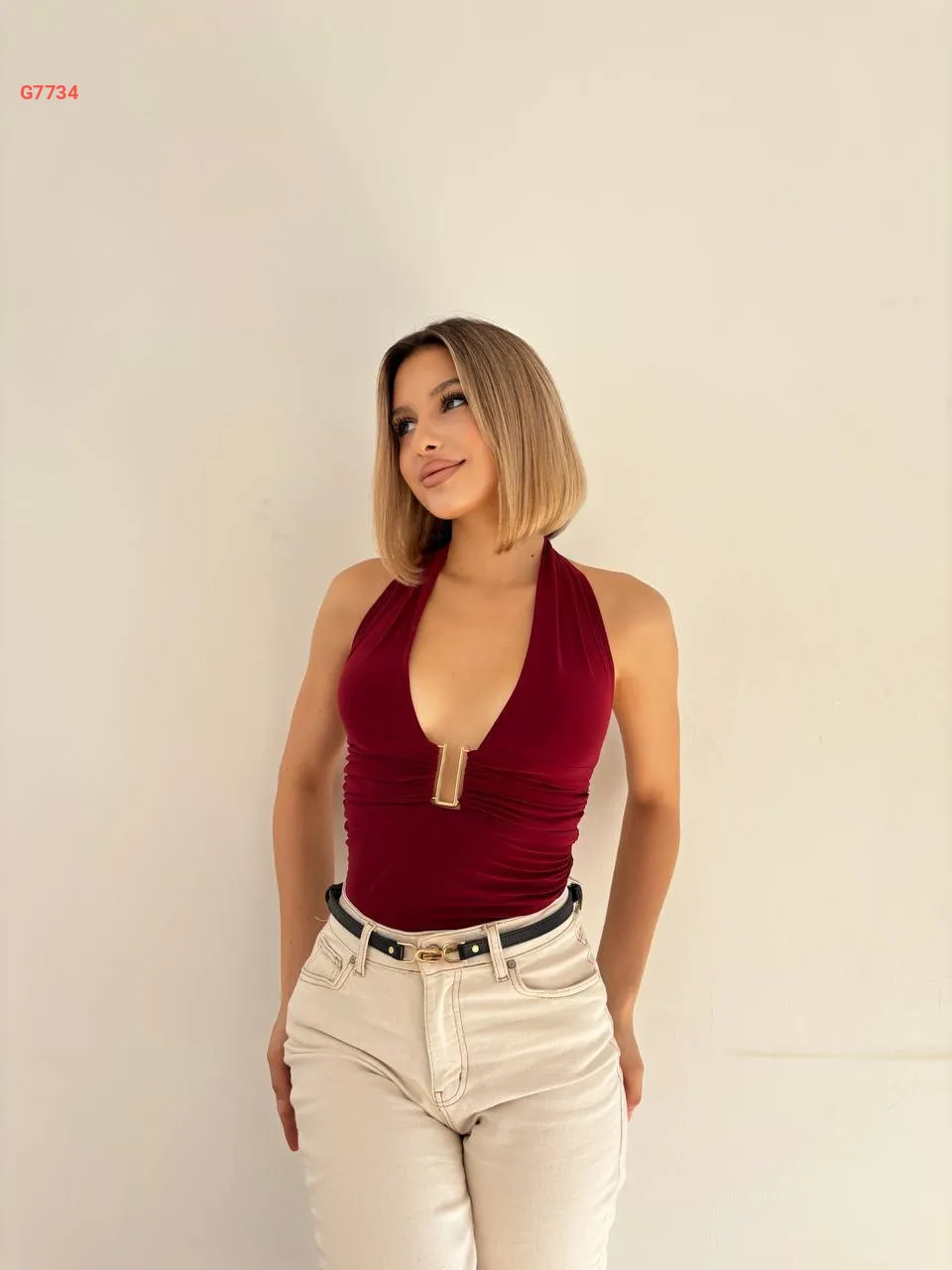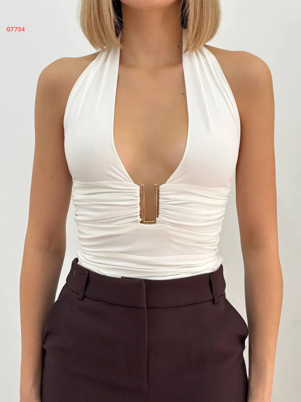 بلوزة بربطة خلفية عالرقبة وإبزيم