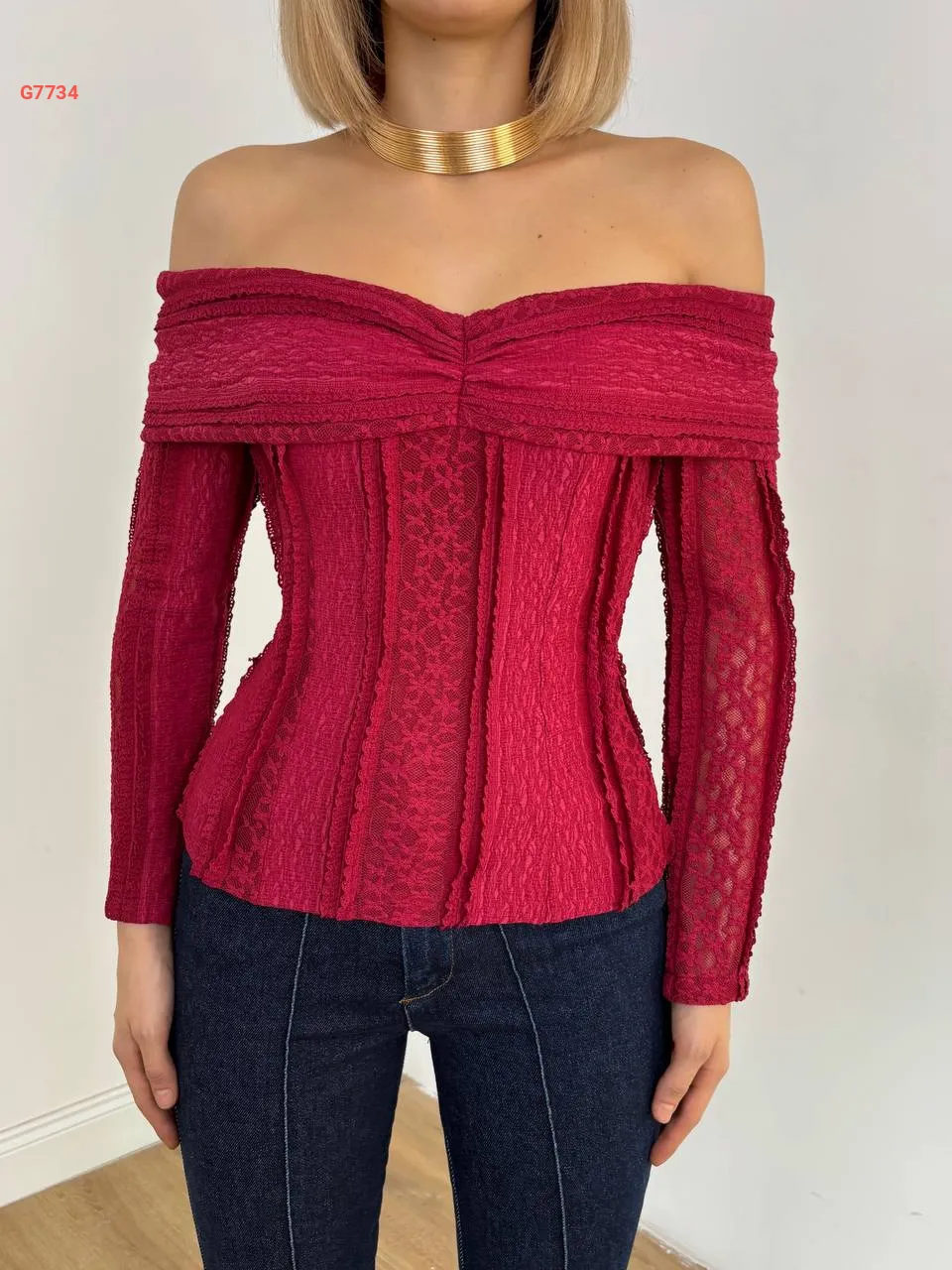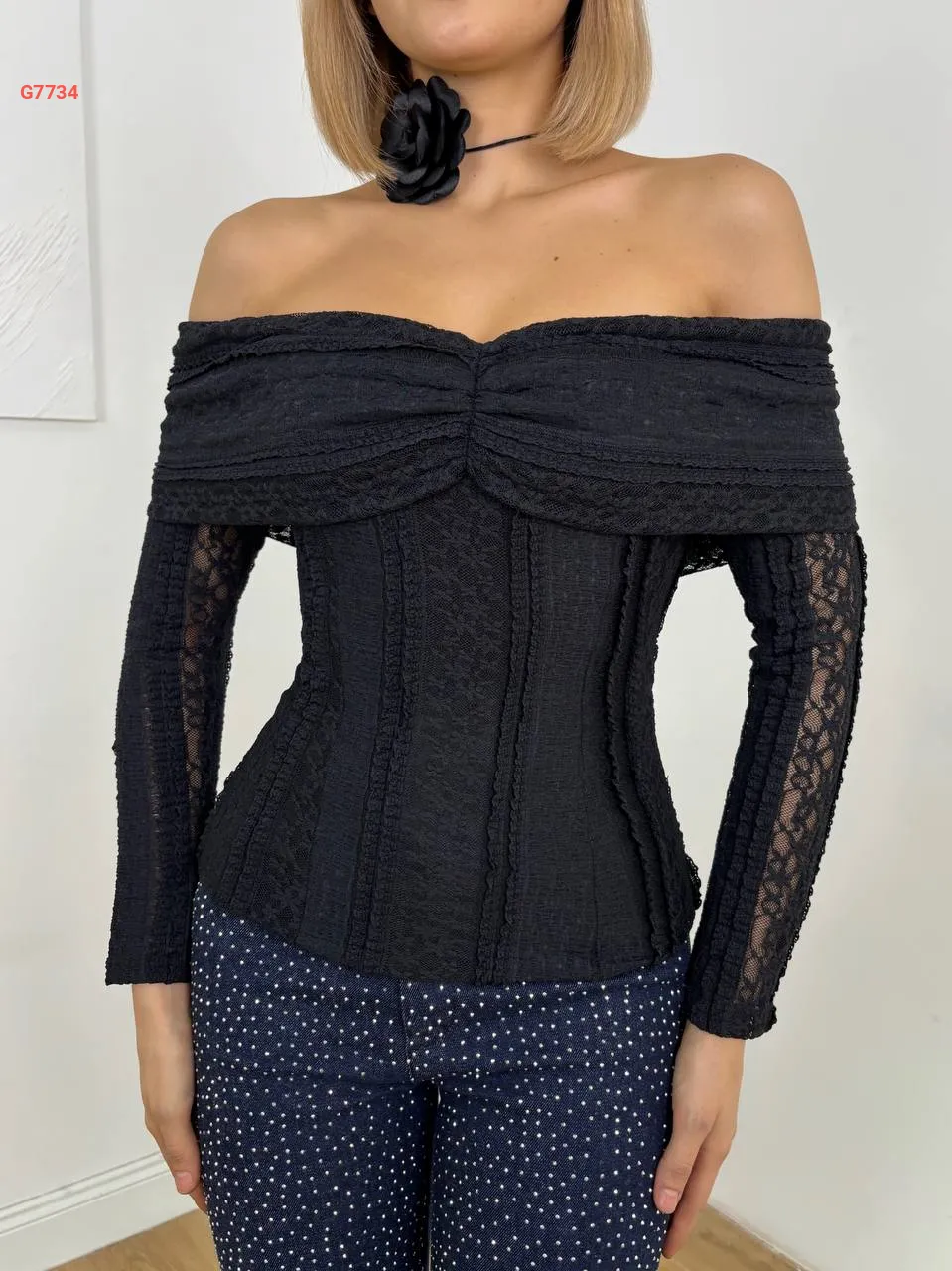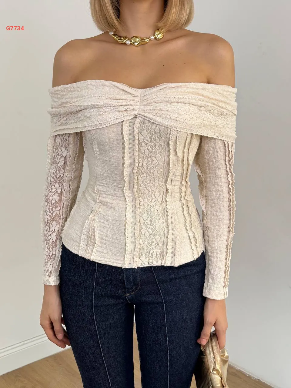 بلوزة بتفاصيل دانتيل وياقة مادونا