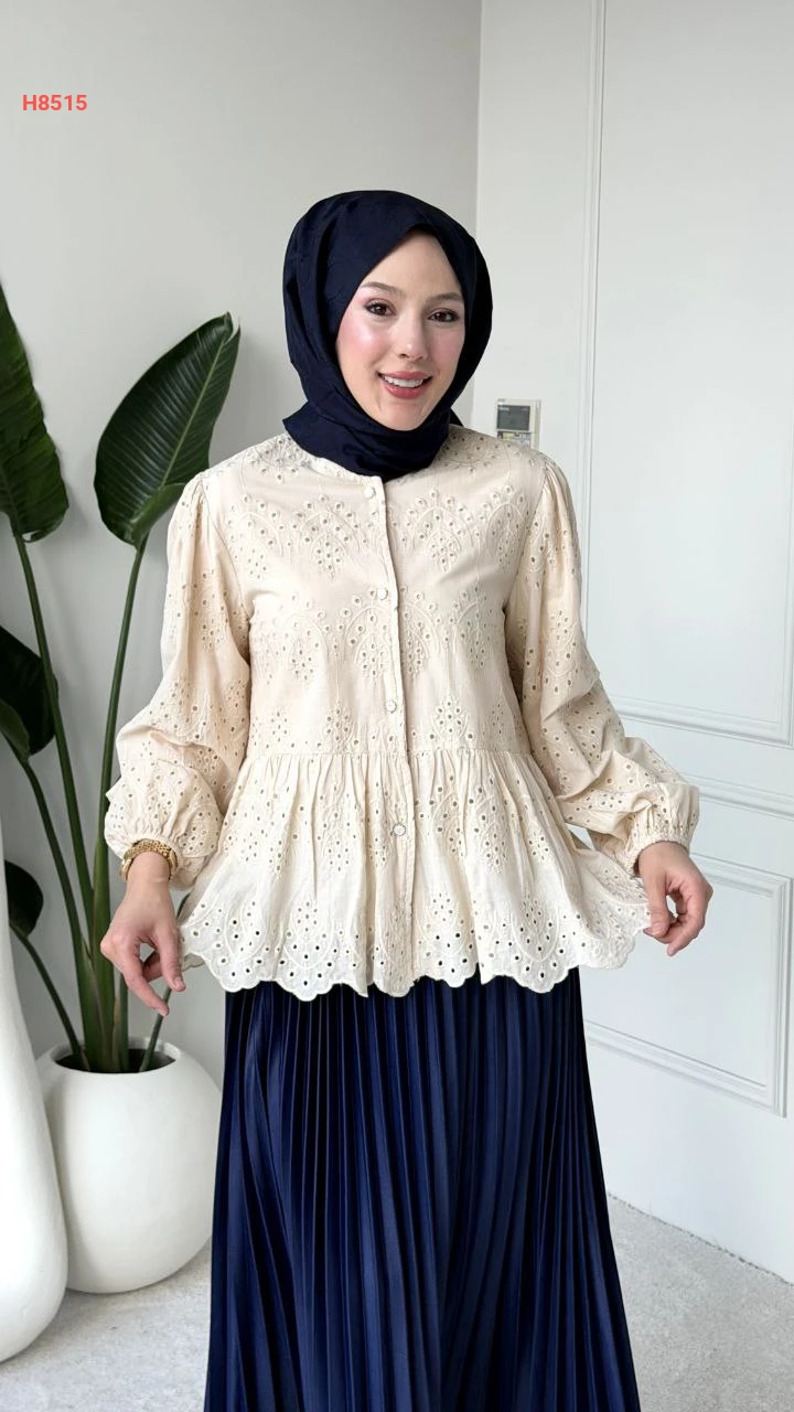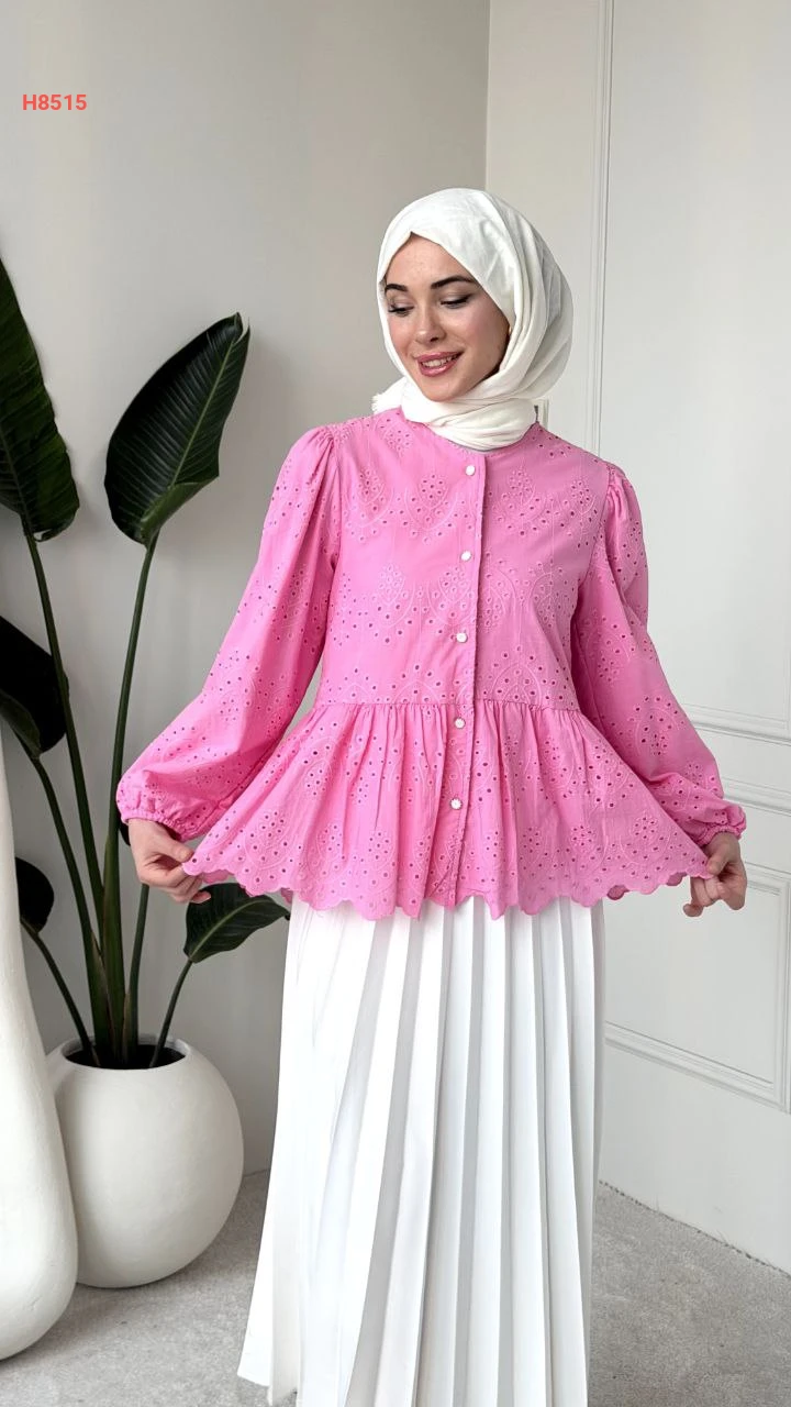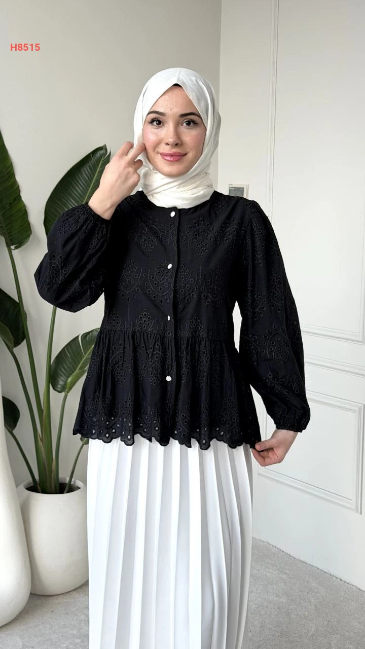 بلوزة بتصميم بيبلوم ونقشات مفرغة وأطراف متموجة
