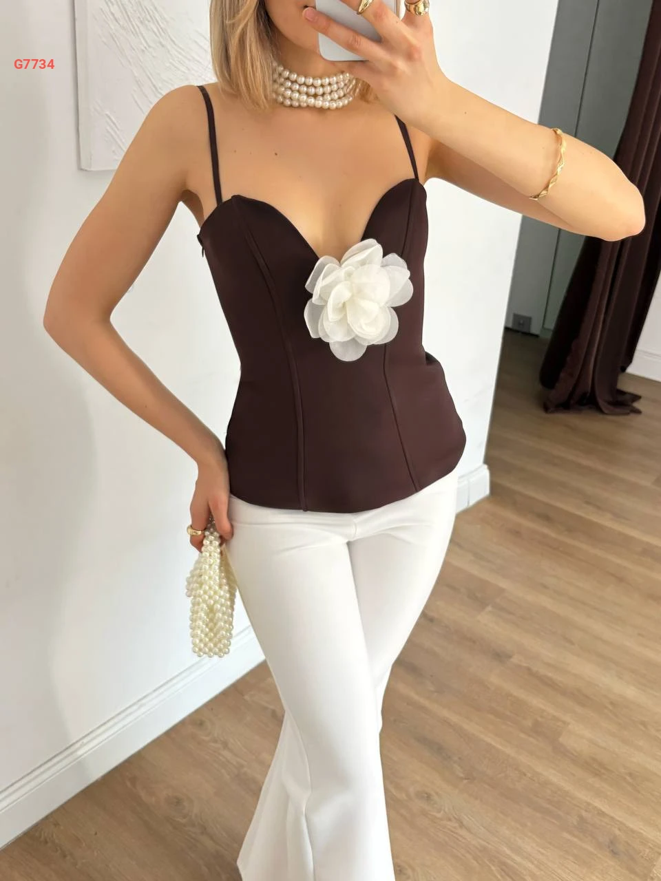 بلوزة بحمالات رفيعة وبروش وردة