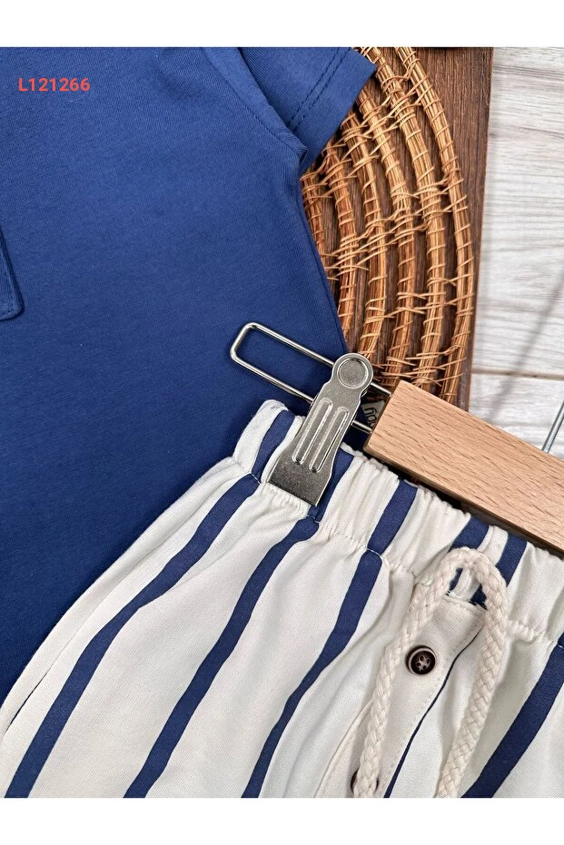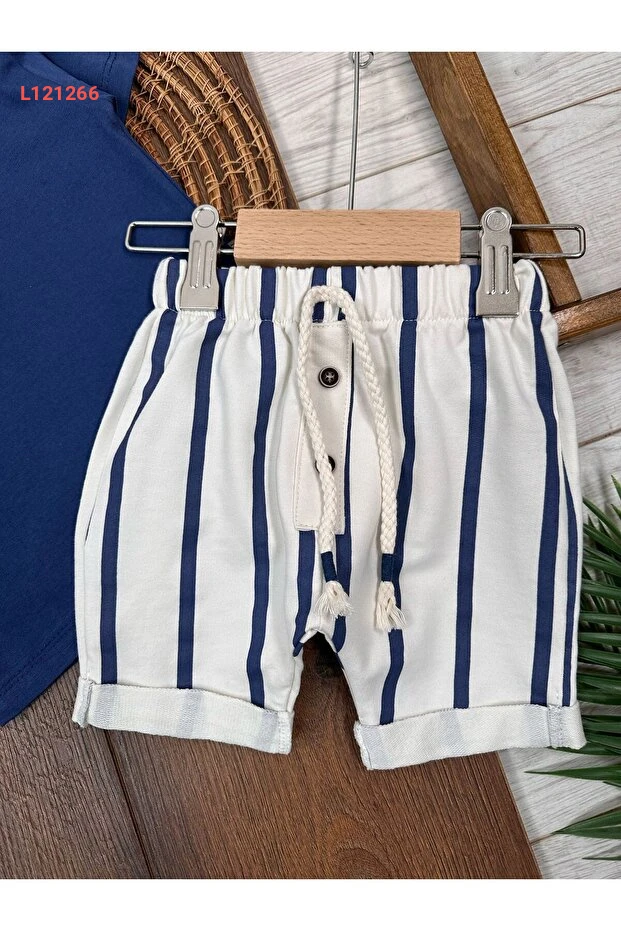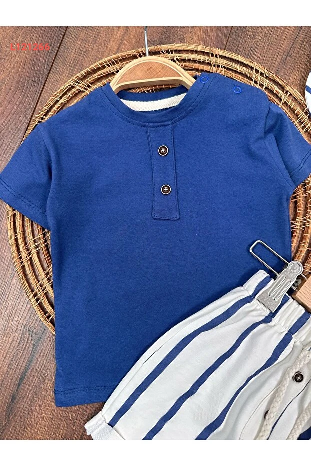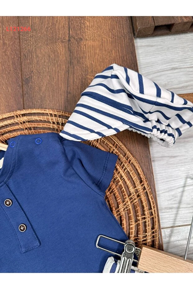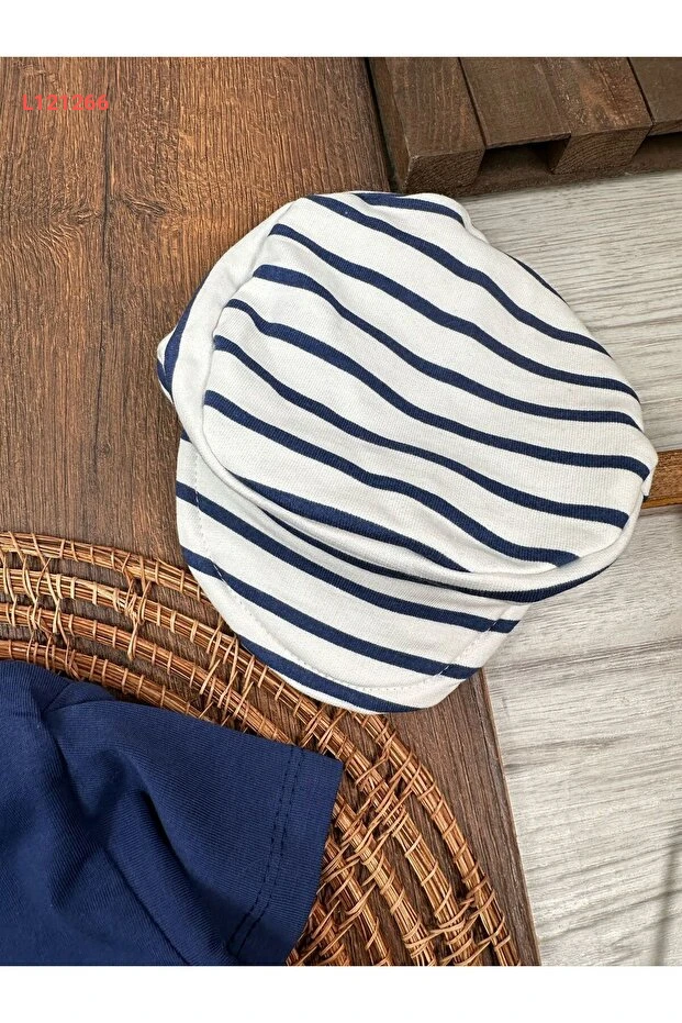 طقم صيفي للأولاد من بولي بيبي: شورت مخطط مع تيشيرت بسيط مزود بقبعة وإغلاق بأزرار على الكتف
