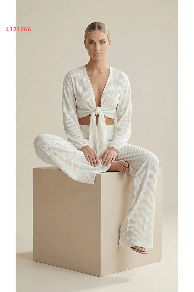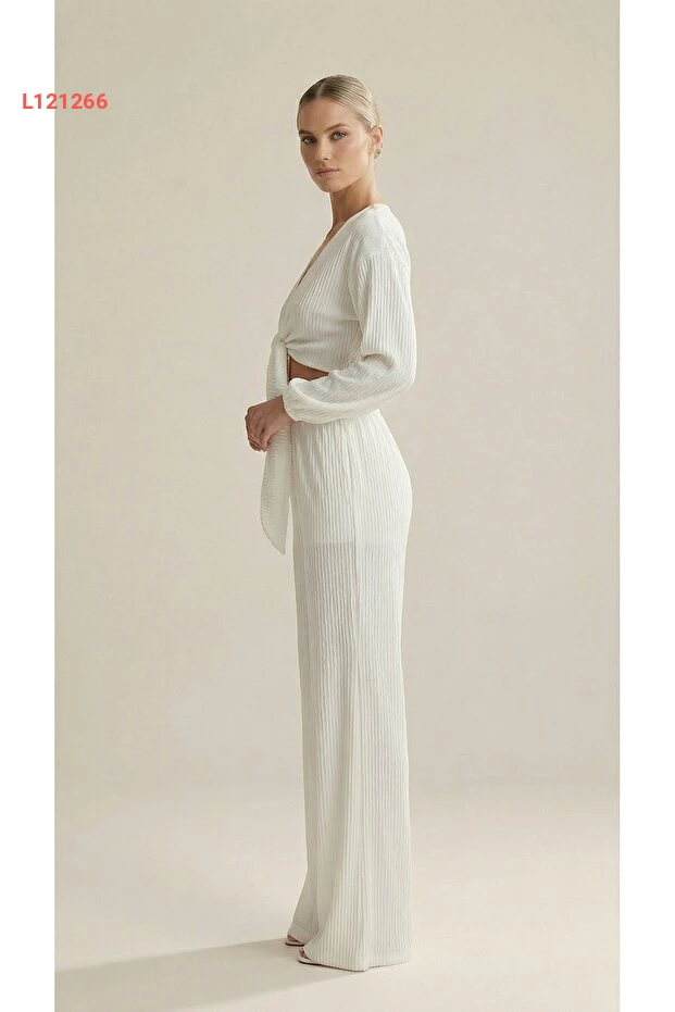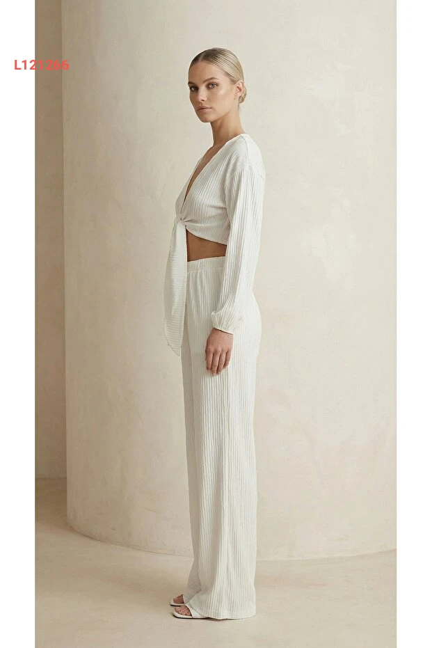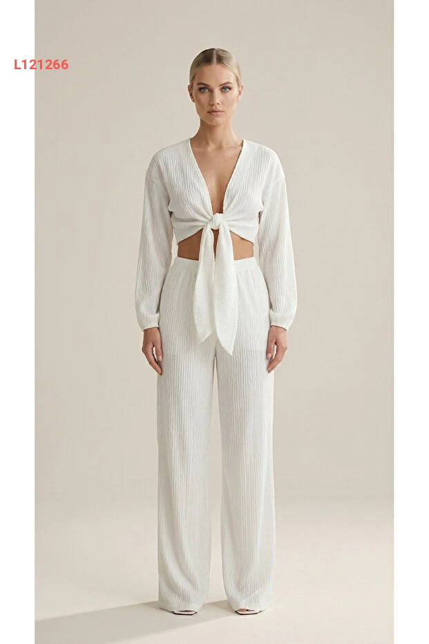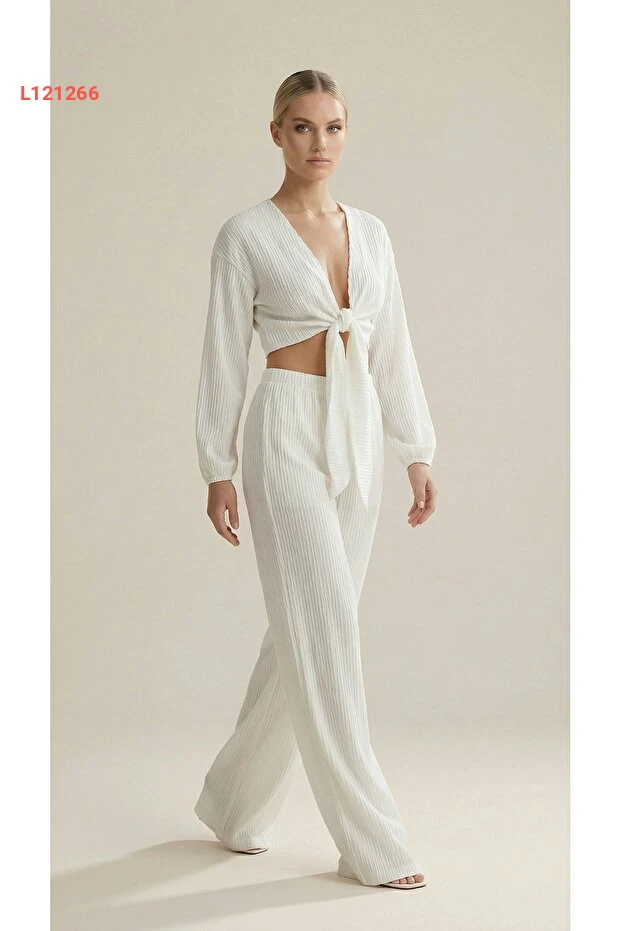 طقم نسائي أبيض: بلوزة متوسطة الطول مع تفاصيل فاخرة وسروال واسع عالي الخصر