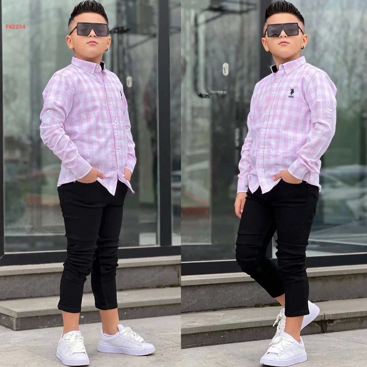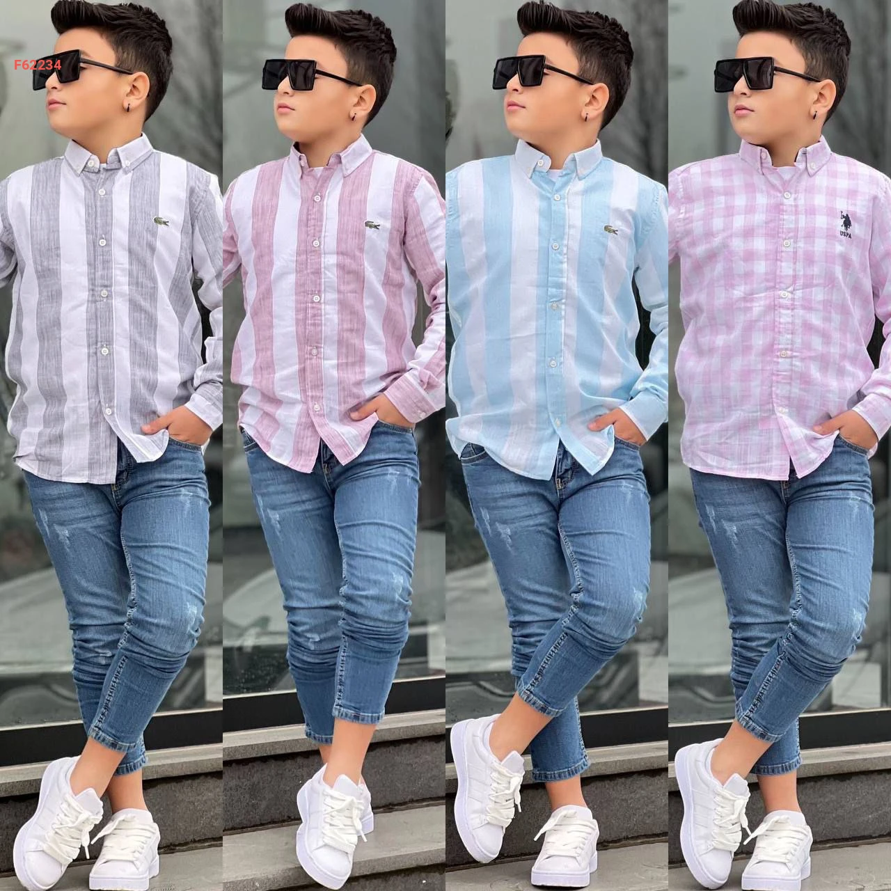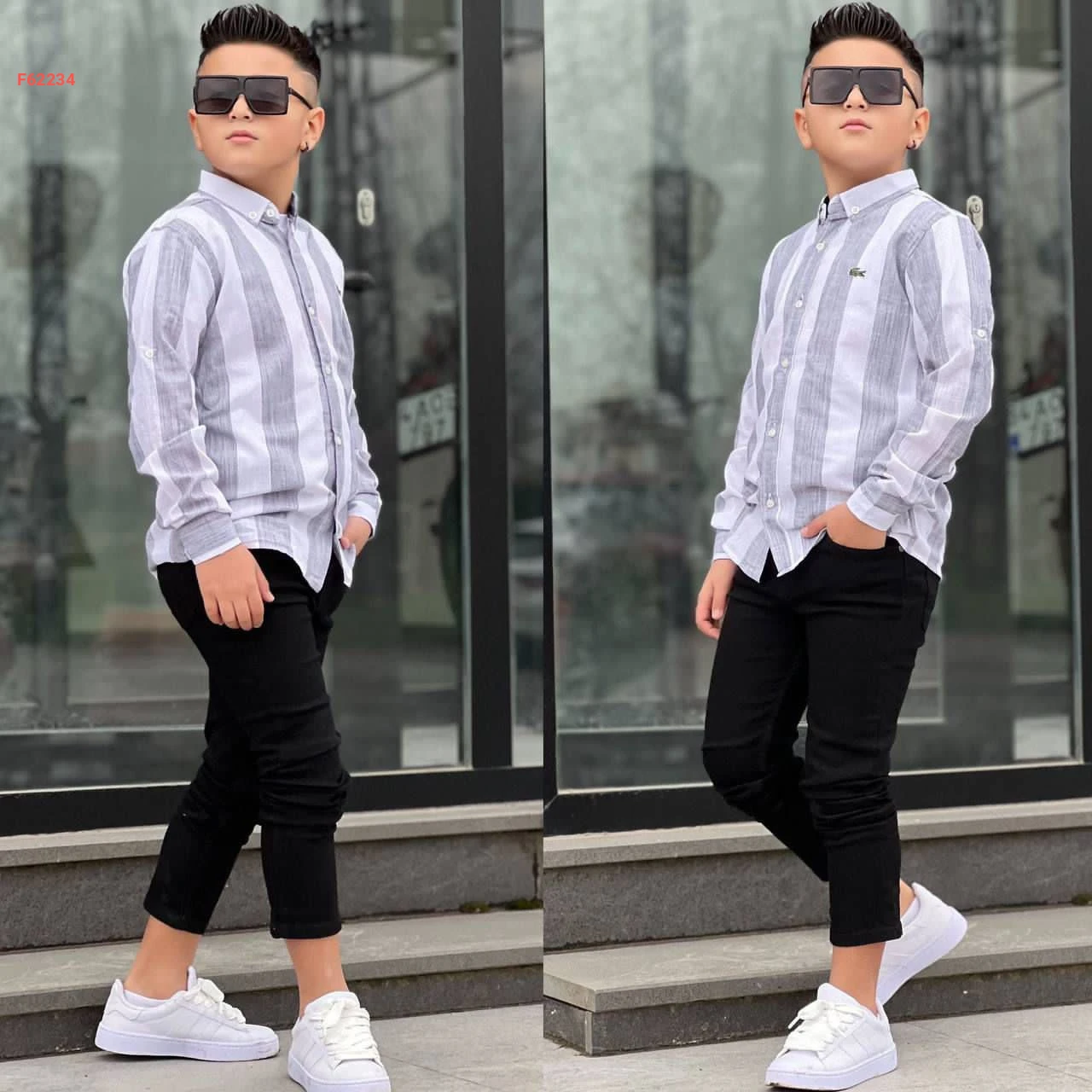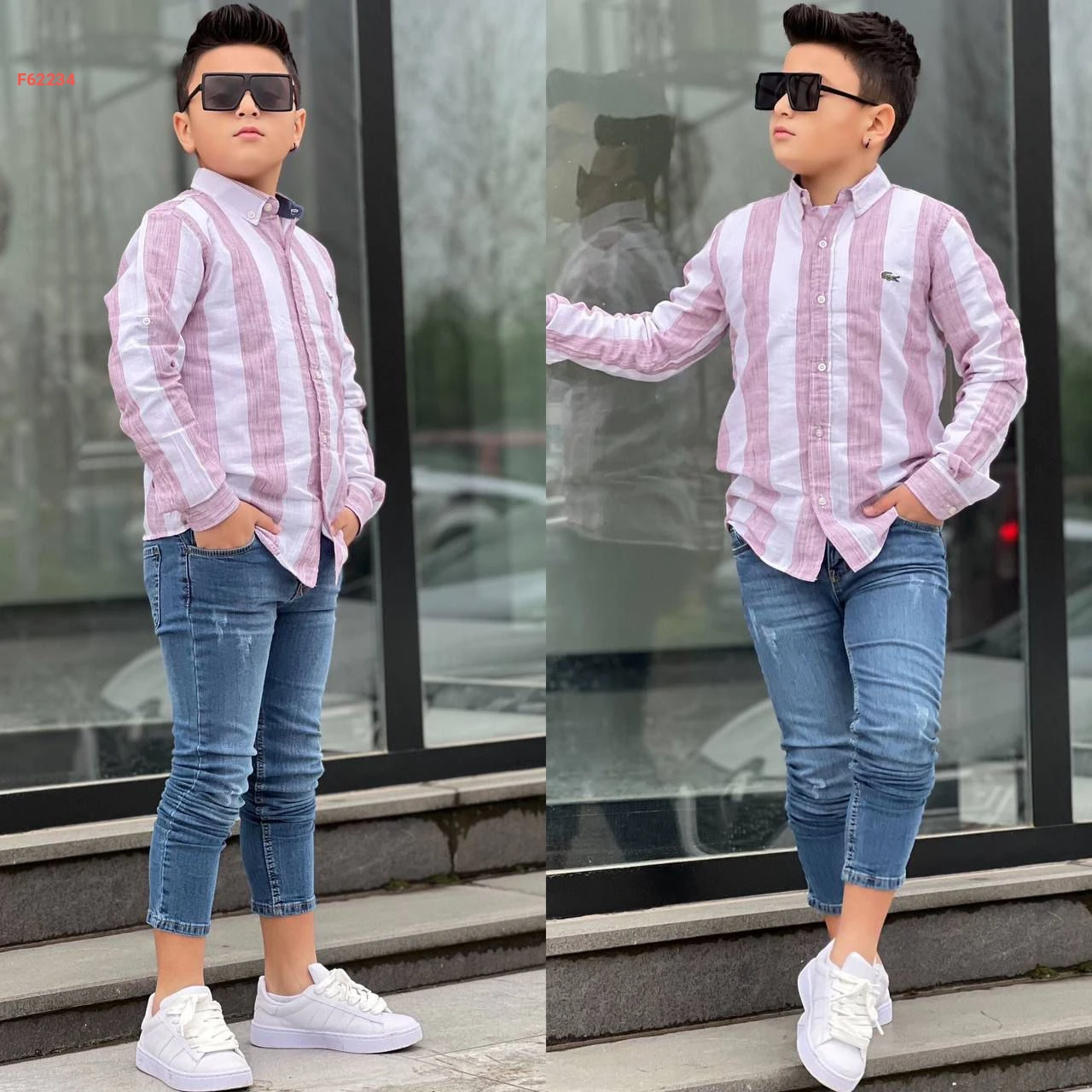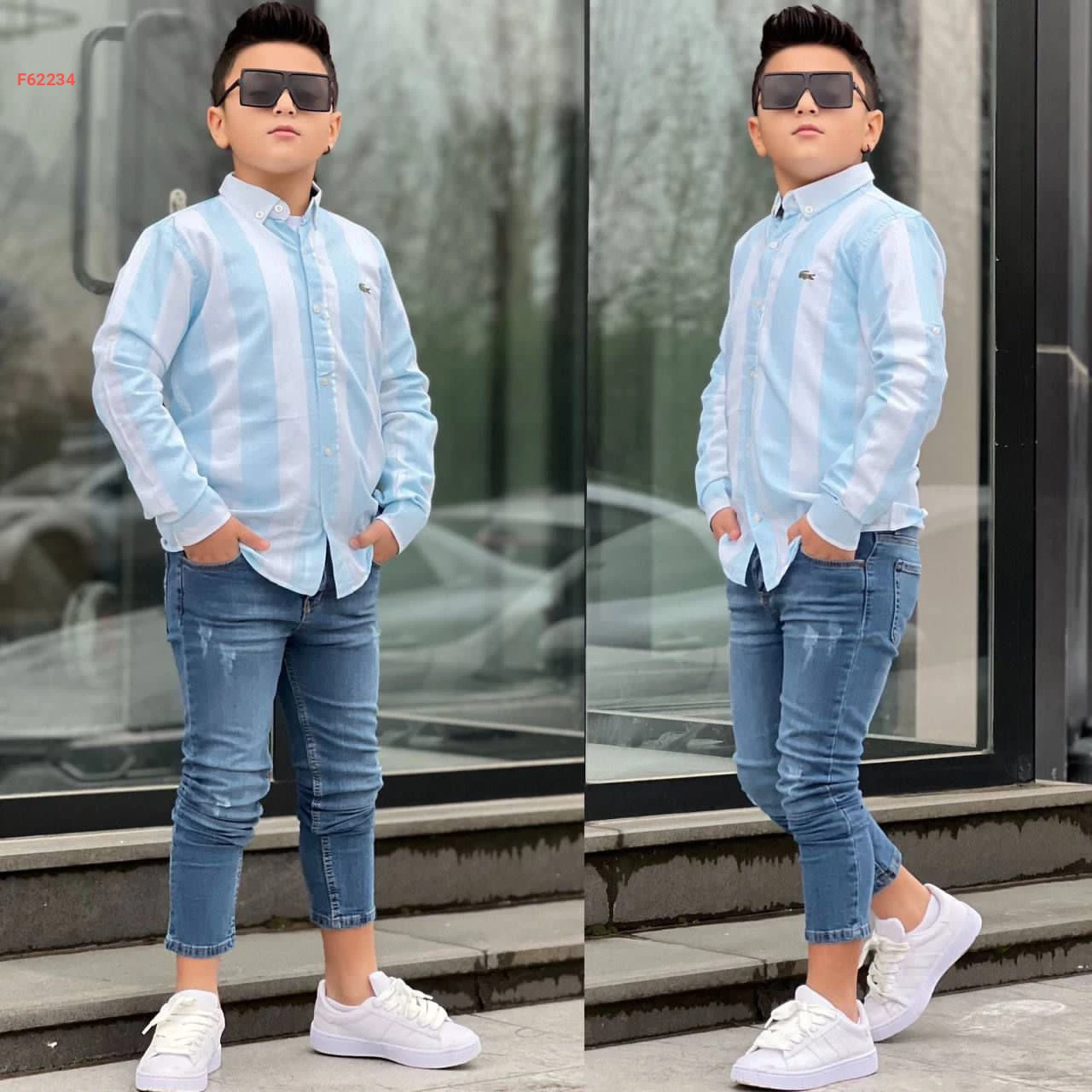 طقم صبياني بنطال وقميص لاكوست مقلم