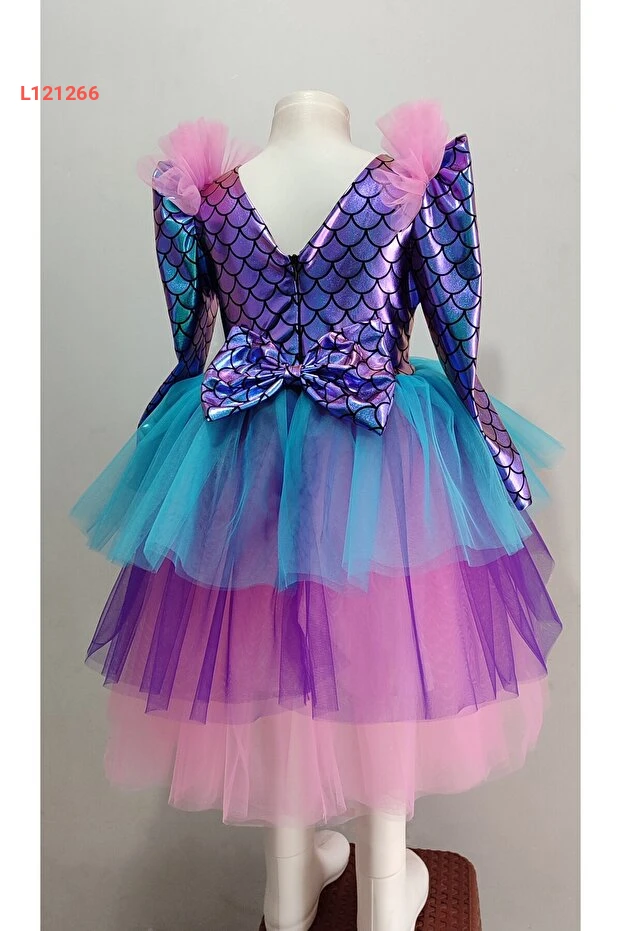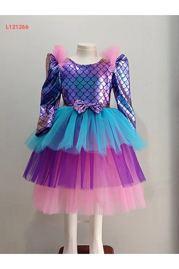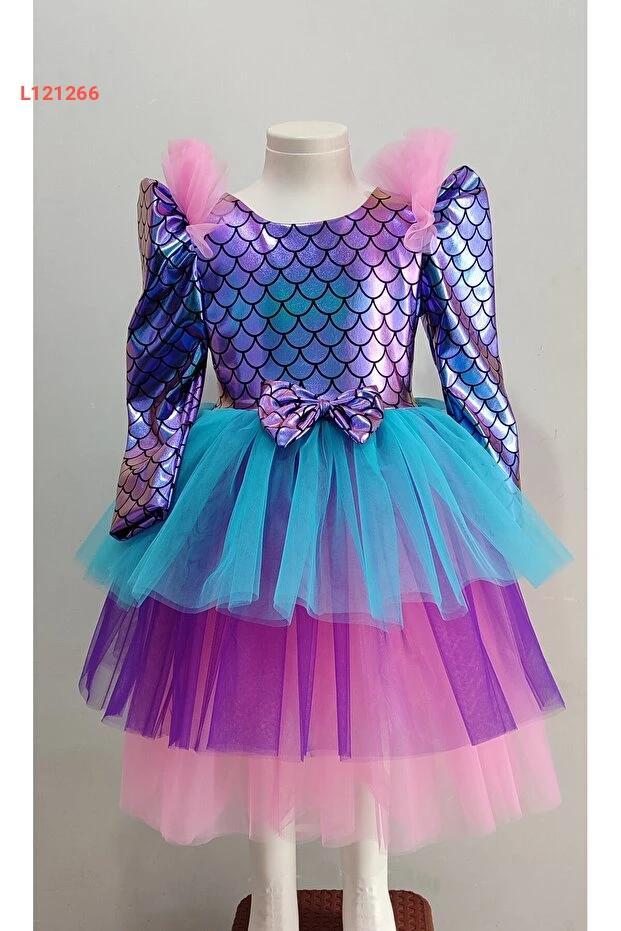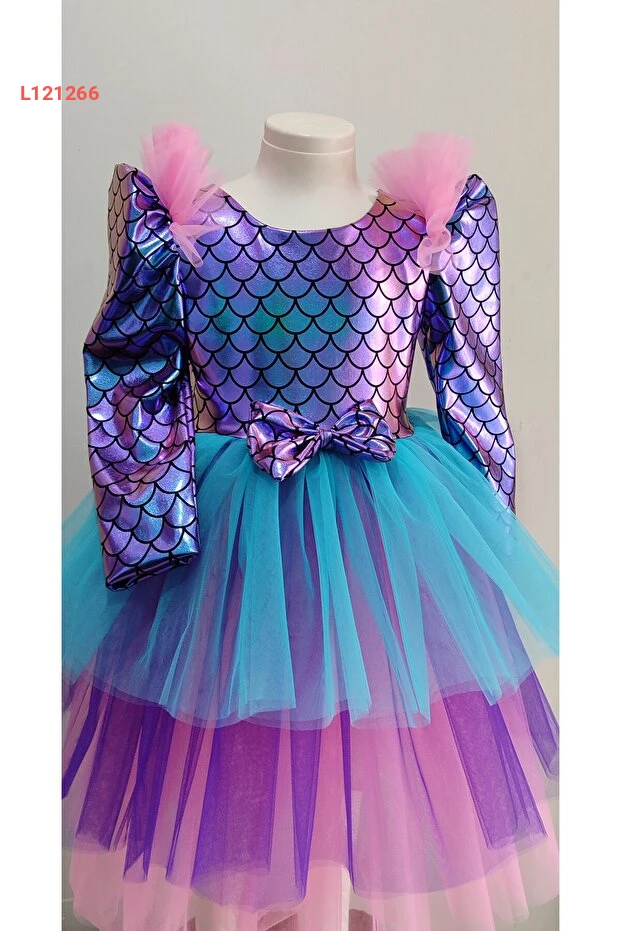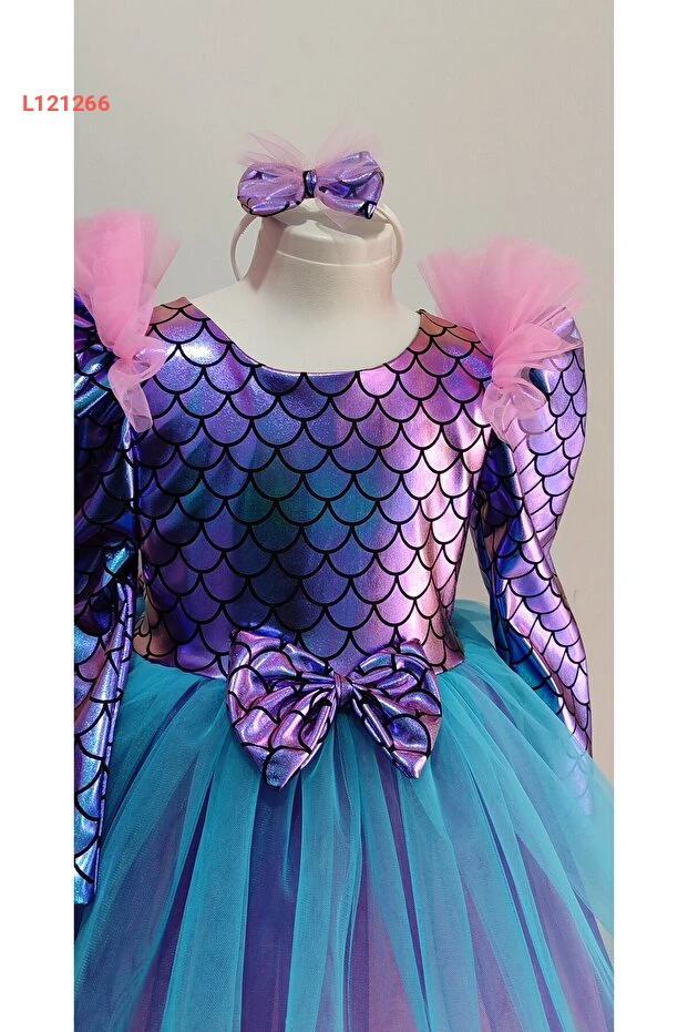 فستان زفاف بحري للأطفال مع طاقية وكم طويل - فستان عيد ميلاد جاذب