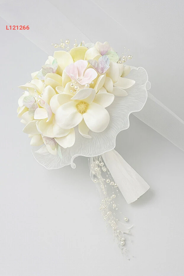 باقة العروس من تول اللؤلؤ مع زهور الماغنوليا والهيدرانجيا