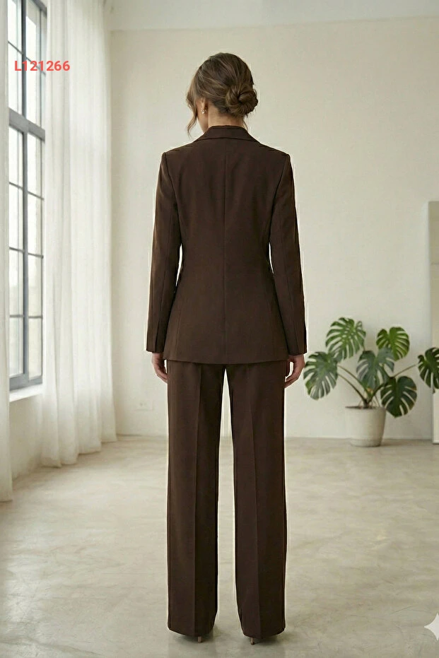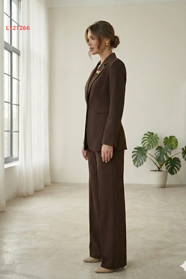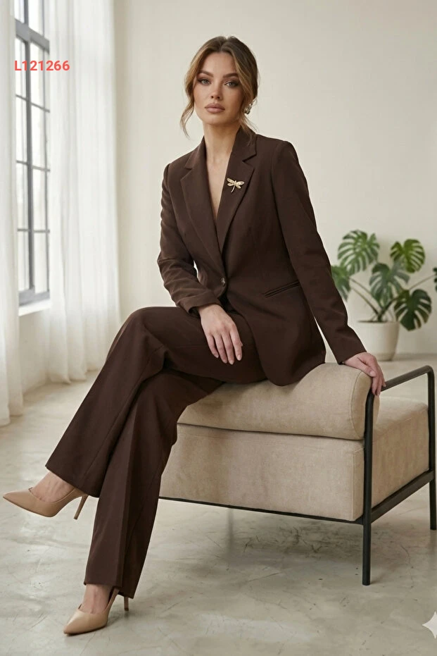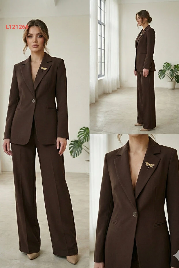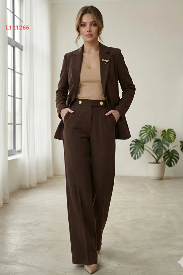 احصلي على إطلالة أنيقة وجذابة مع طقم البدلة المكون من جاكيت بلزار بني مزود بوسيلة زينة فريدة وسروال قماش متناسق. يتميز التصميم بأزرار واحدة يمنحك مظهرًا عصريًا، بينما يوفر البطانة المريحة حرية الحركة والراحة طوال اليوم. مثالي للمناسبات الرسمية أو أيام العمل، يجعل هذا الطقم كل لحظة مميزة.