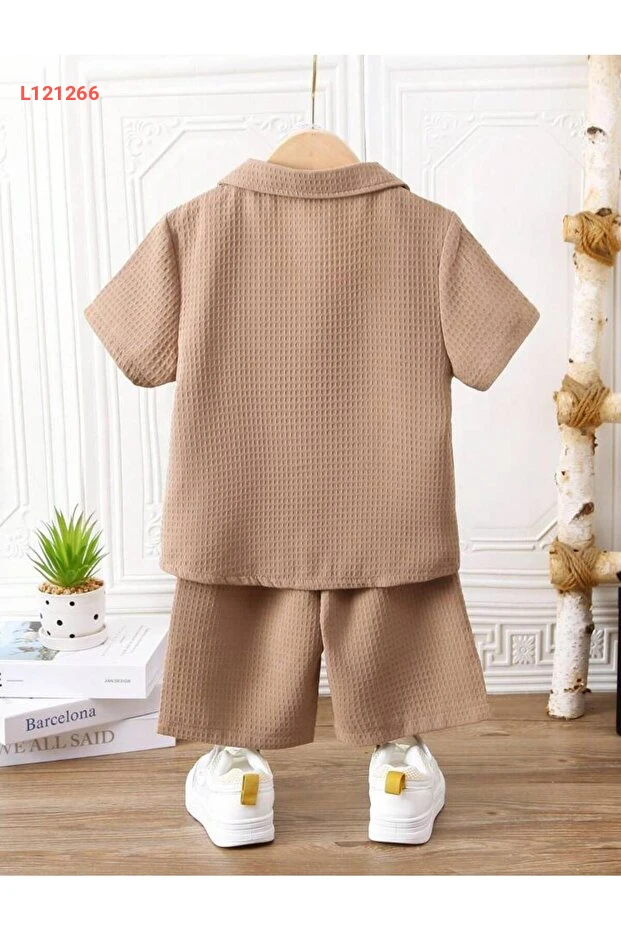 طقم شورت بيج من القطن مع قميص بياقة على شكل V - بوبيتو