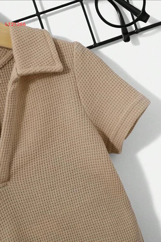 طقم شورت صيفي للأطفال مع تيشيرت V ياقه من بوبيتو - بيج