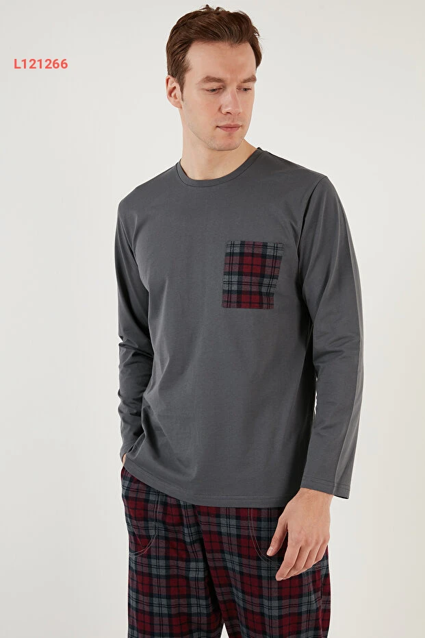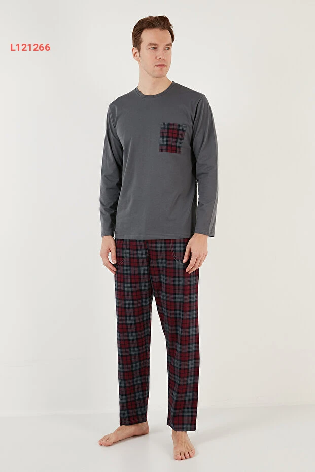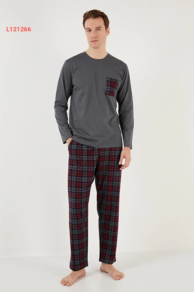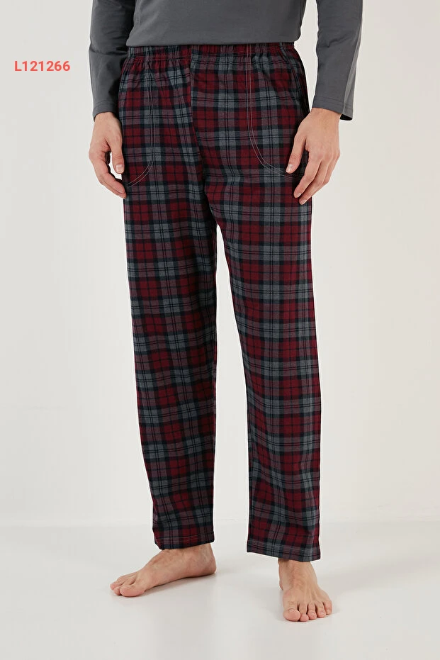 طقم بيجامة رجالي بنمط مربعات وحزام مرن من 100% قطن - طراز ريغولار فيت