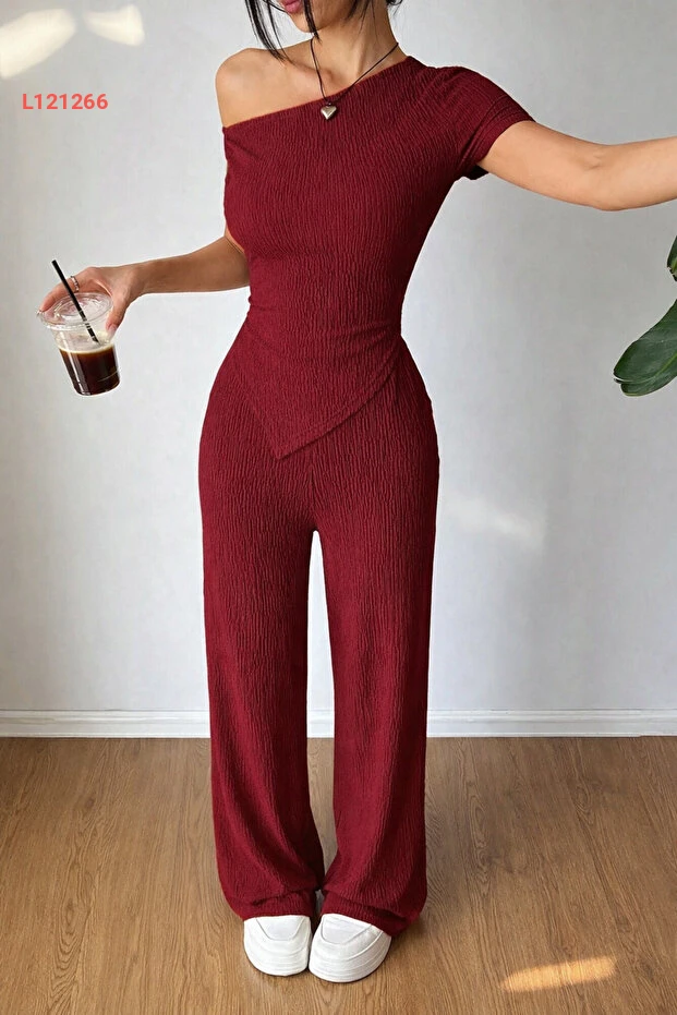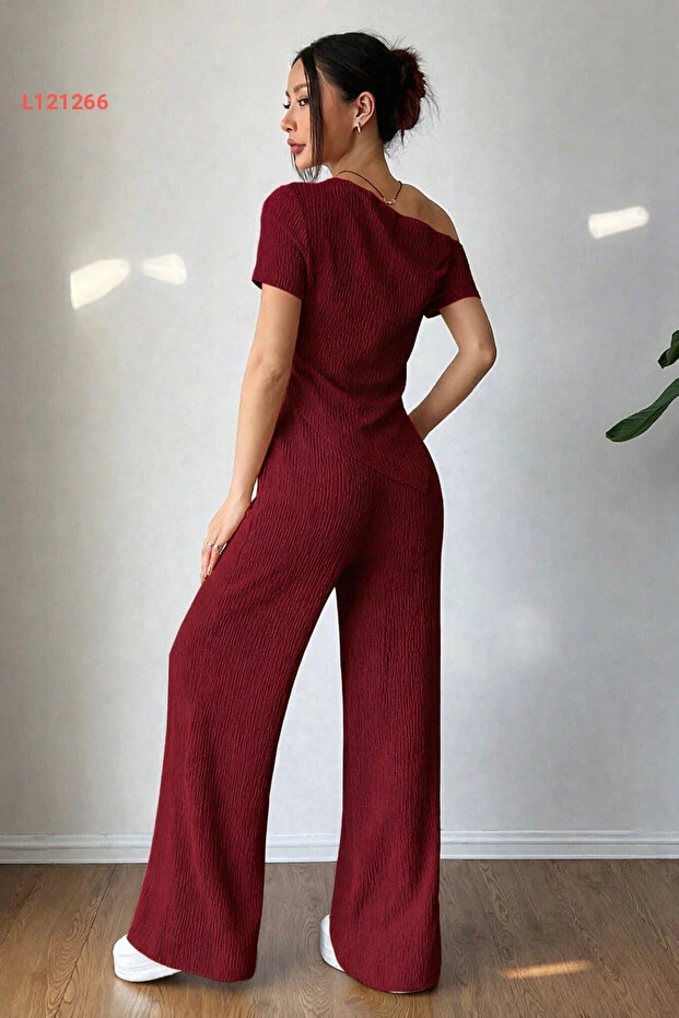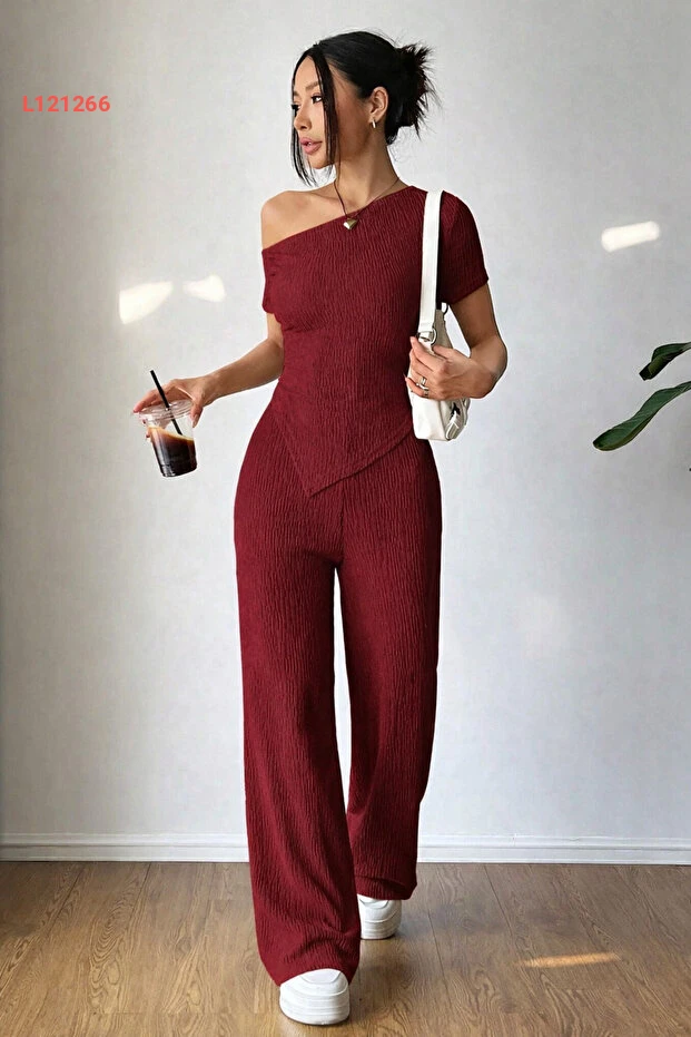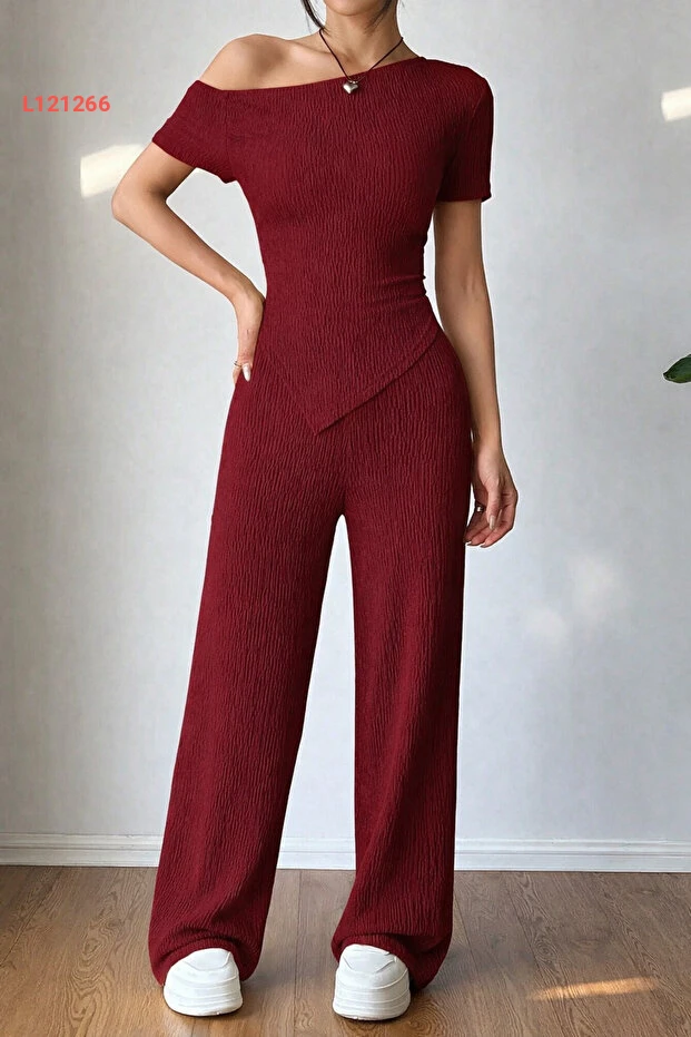 طقم سويت شيرت وبنطلون بوردو بأكتاف منخفضة وحافة غير متماثلة
