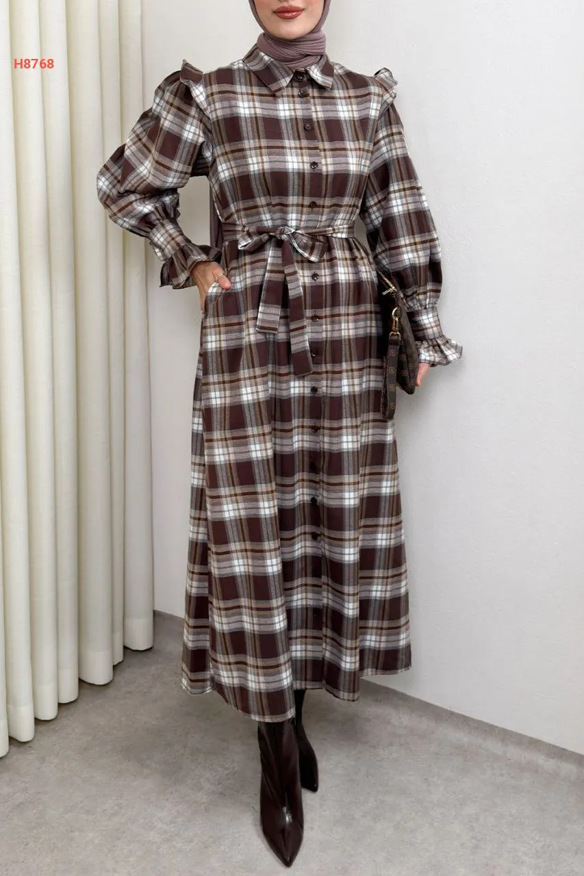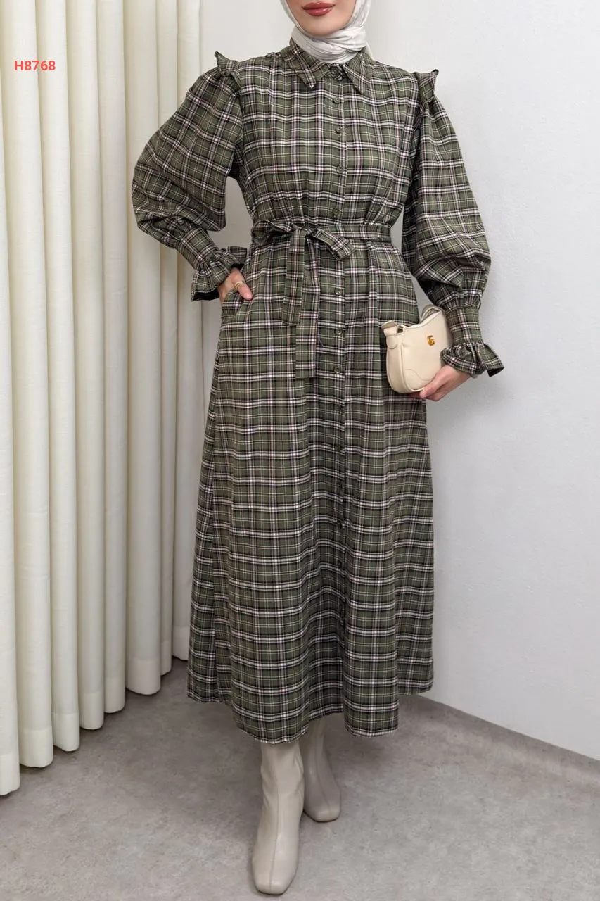 فستان كاروهات بأزرار ، مع ربطة خصر