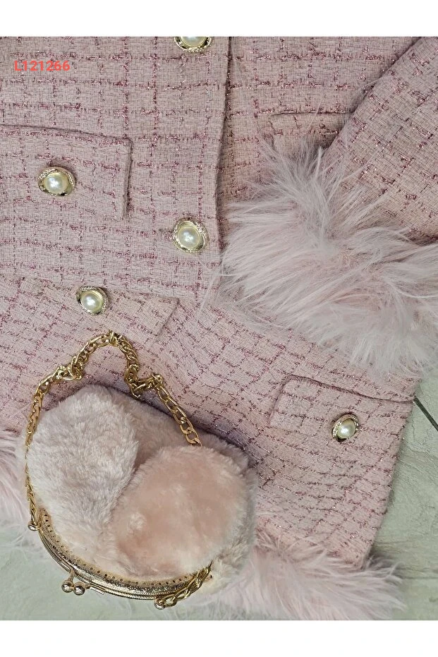 مجموعة فيزا للأطفال: طقم أنيق مكون من 3 قطع لبنت – جاكيت مصنوع من قماش تويد مع تنورة وحقيبة - تفاصيل بولوش الناعمة – لون كريمي / وردي – للأعمار بين 5-13 سنة
