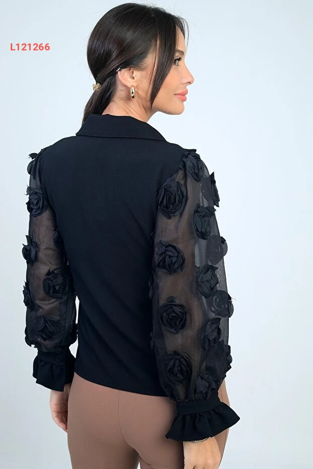 بلوزة نسائية من سايغى بأزرار أمامية وأكمام شفافة مزخرفة بتصميم ثلاثي الأبعاد من الزهور