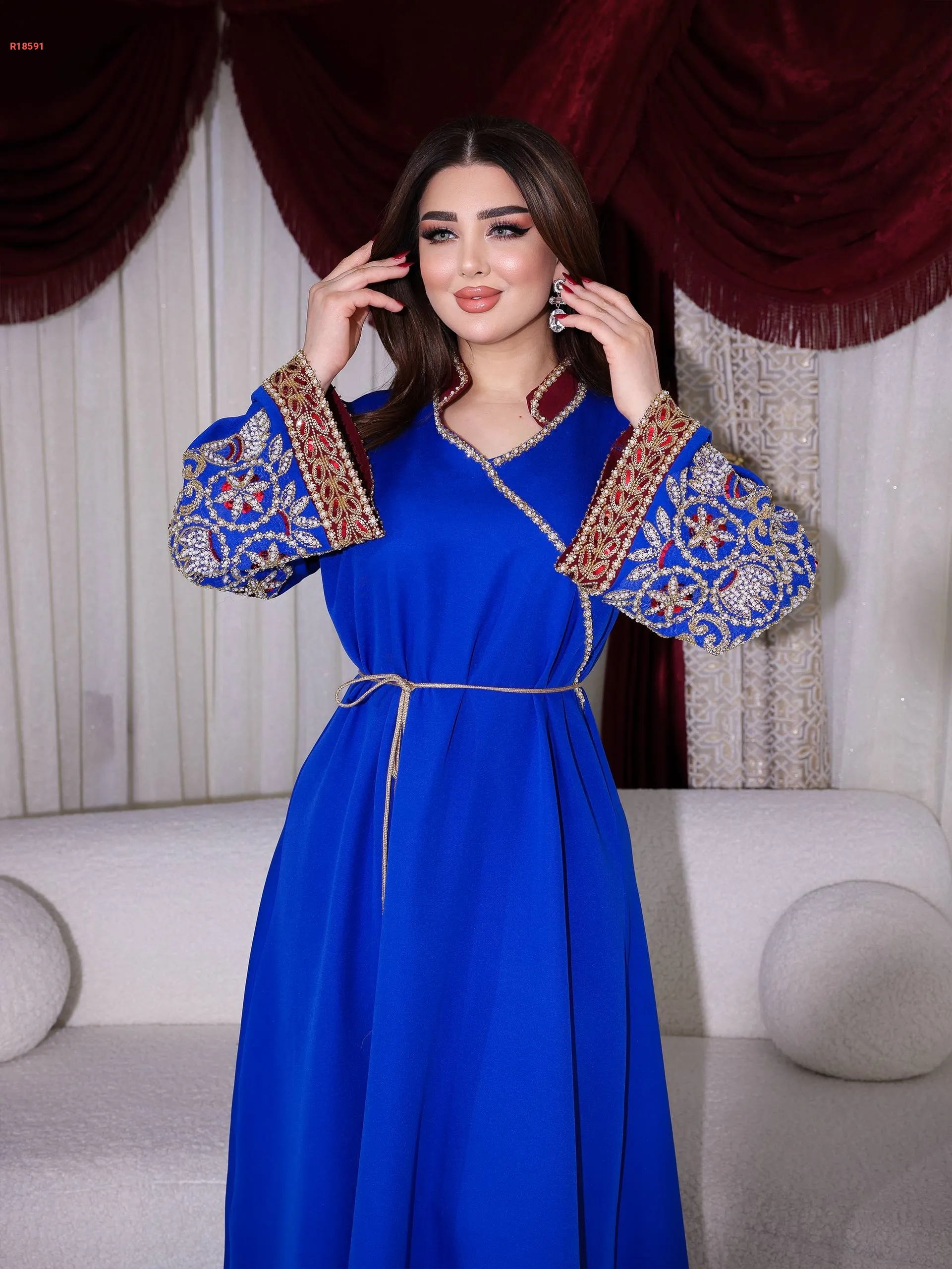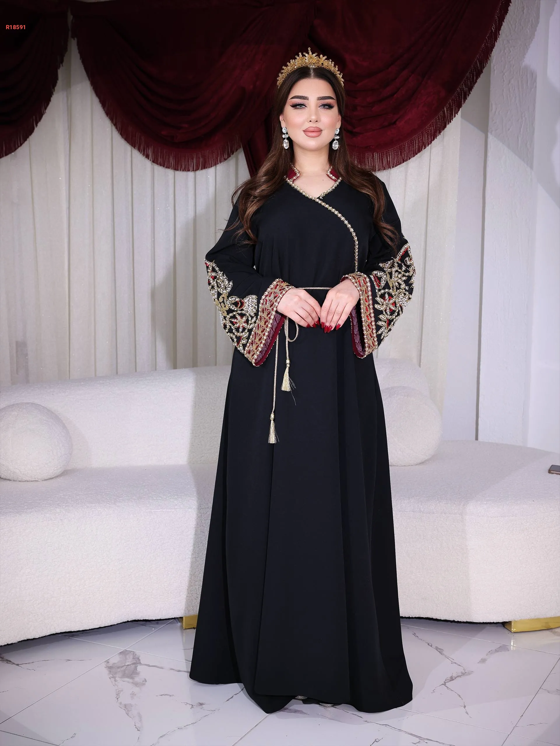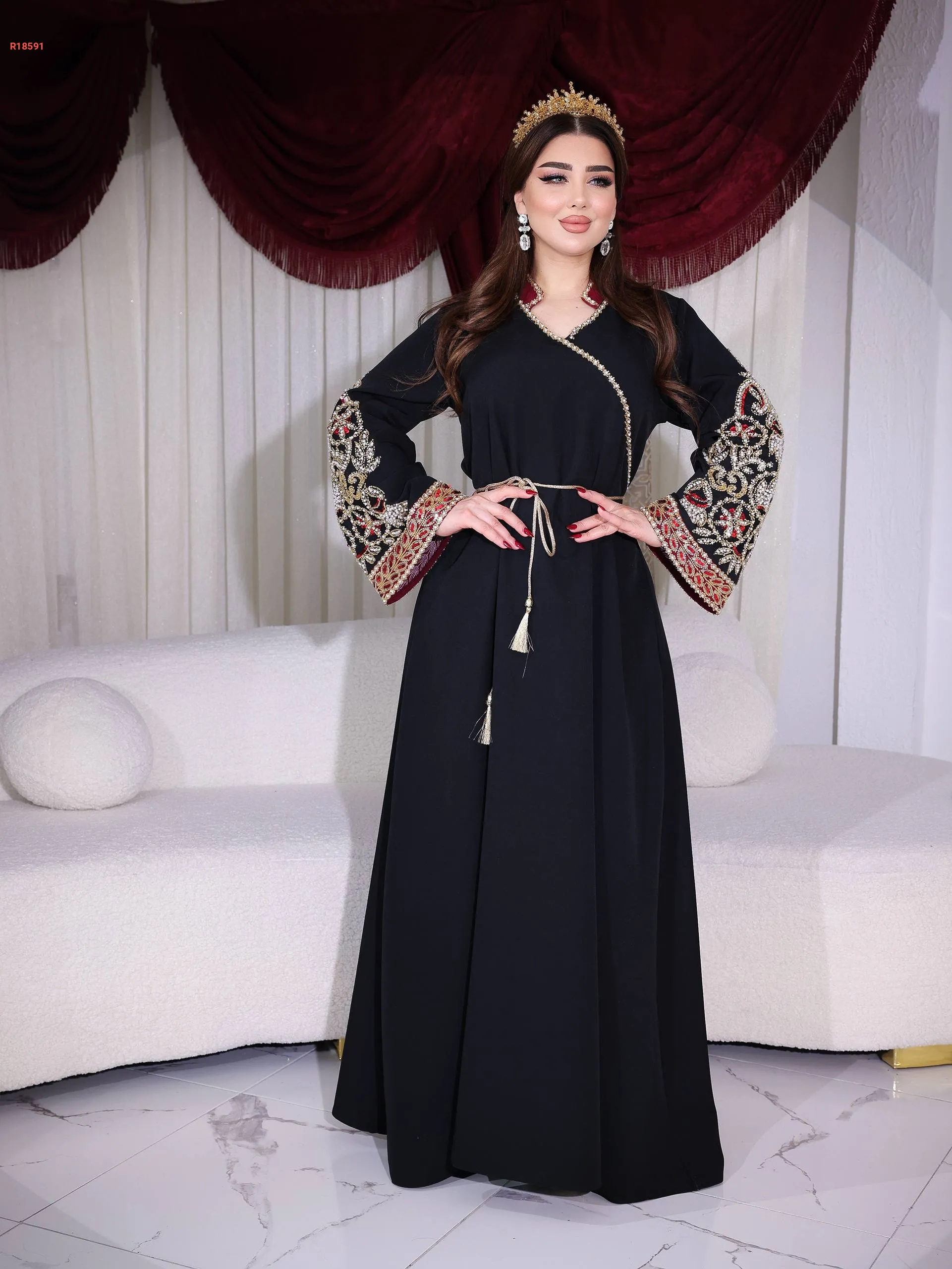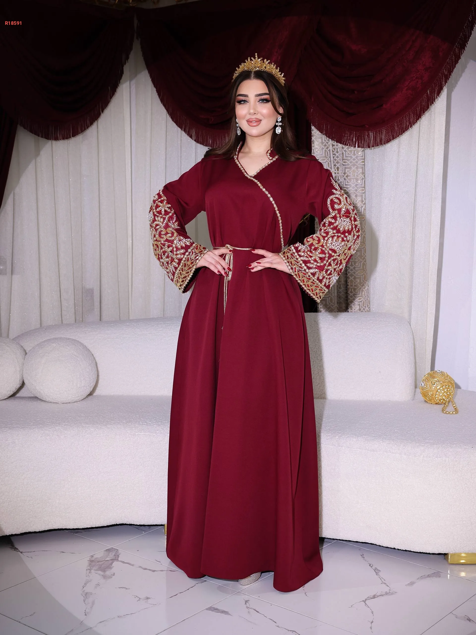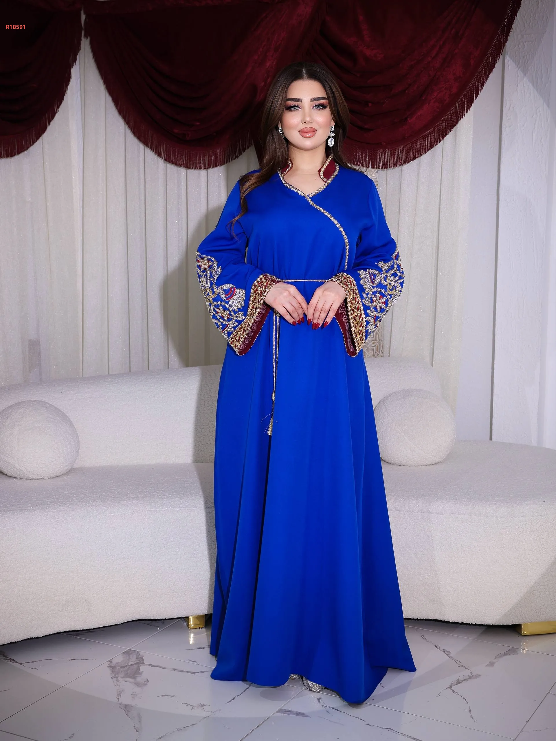 عباية قفطان تطريز شك على الأكمام ، مع ربطة خصر