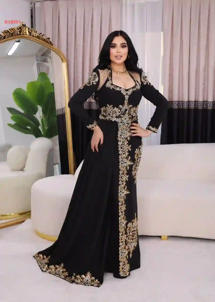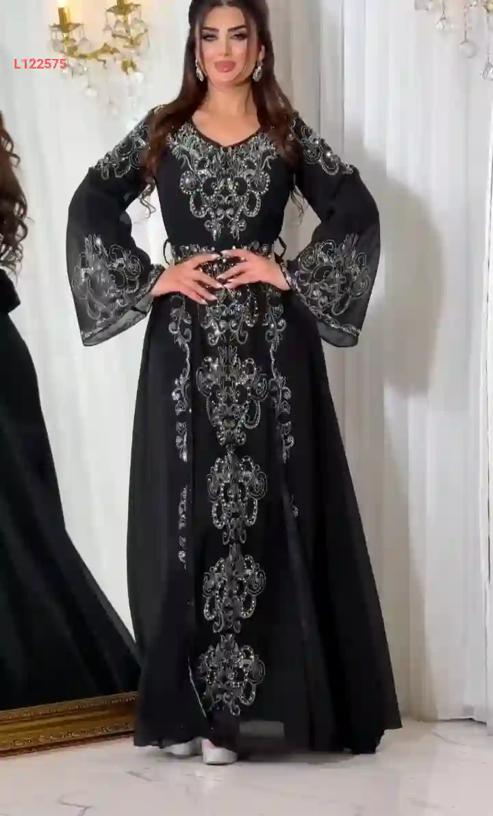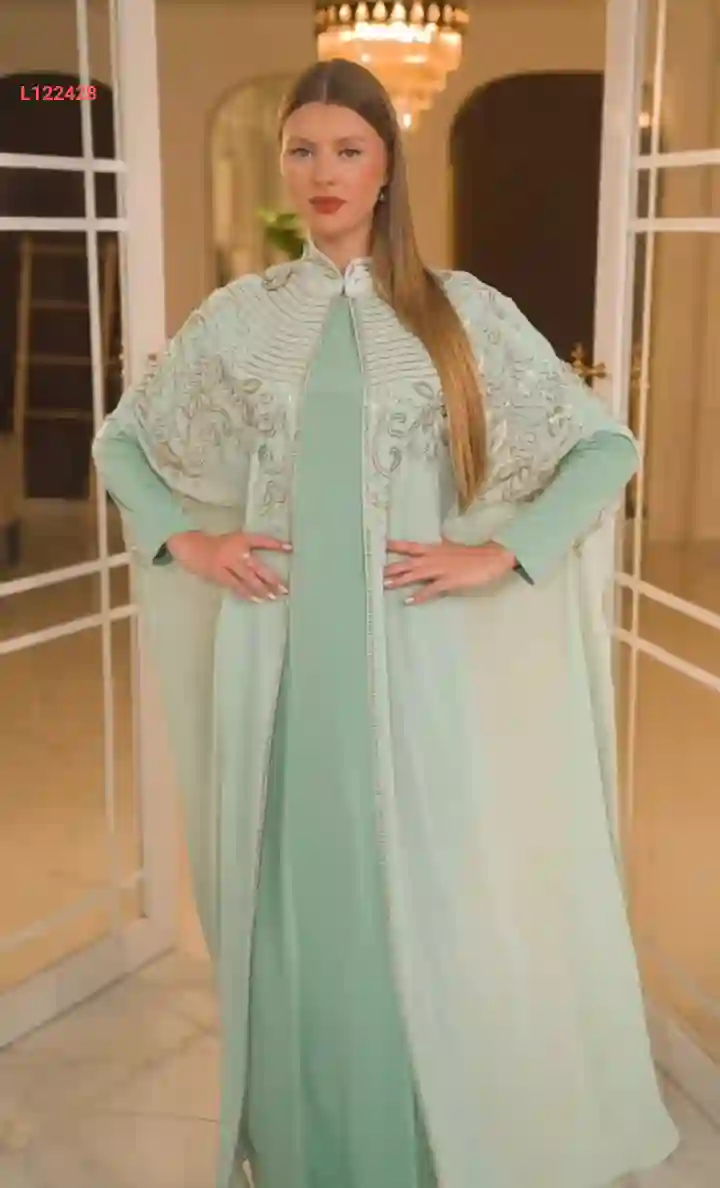 ✨ قفطان ملكي تفاصيل فاخرة بتطريز خرز وسيلان، وسحبات تكسير وزمّ من الصدر للرقبة تضيف فخامة ملوكية. الكاب الطويل ينساب بانسيابية وأناقة تبقى في الذاكرة. الألوان: مينت – أسود – خمري المقاسات: 38-50 👑 الفخامة التي تُروى بها الحكايات.