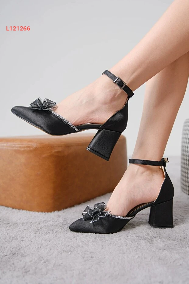 أحذية سهرة نسائية بكعب عريض من قماش التول الأسود مزينة بفيونكة