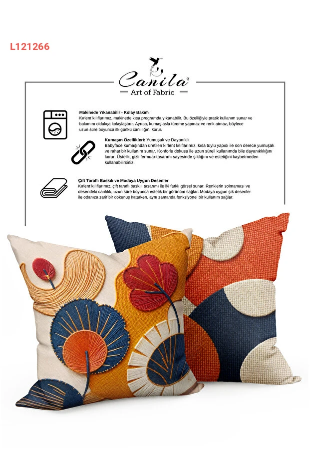 استمتع بإطلالة جديدة لمنزلك مع غطاء الوسادة CANİLA المُزخرف بتصميمات تجريدية رائعة، والذي يضفي لمسة من الأناقة على أي غرفة. مصنوع من قماش عالي الجودة ومطبوع بتقنية رقمية، يأتي هذا الغطاء بقفل سري مزدوج الجوانب، مما يسهل عليك تغييره حسب أجواءك ورغباتك. اجعل كل جلسة مريحة وعصرية مع هذا الاختيار المثالي!